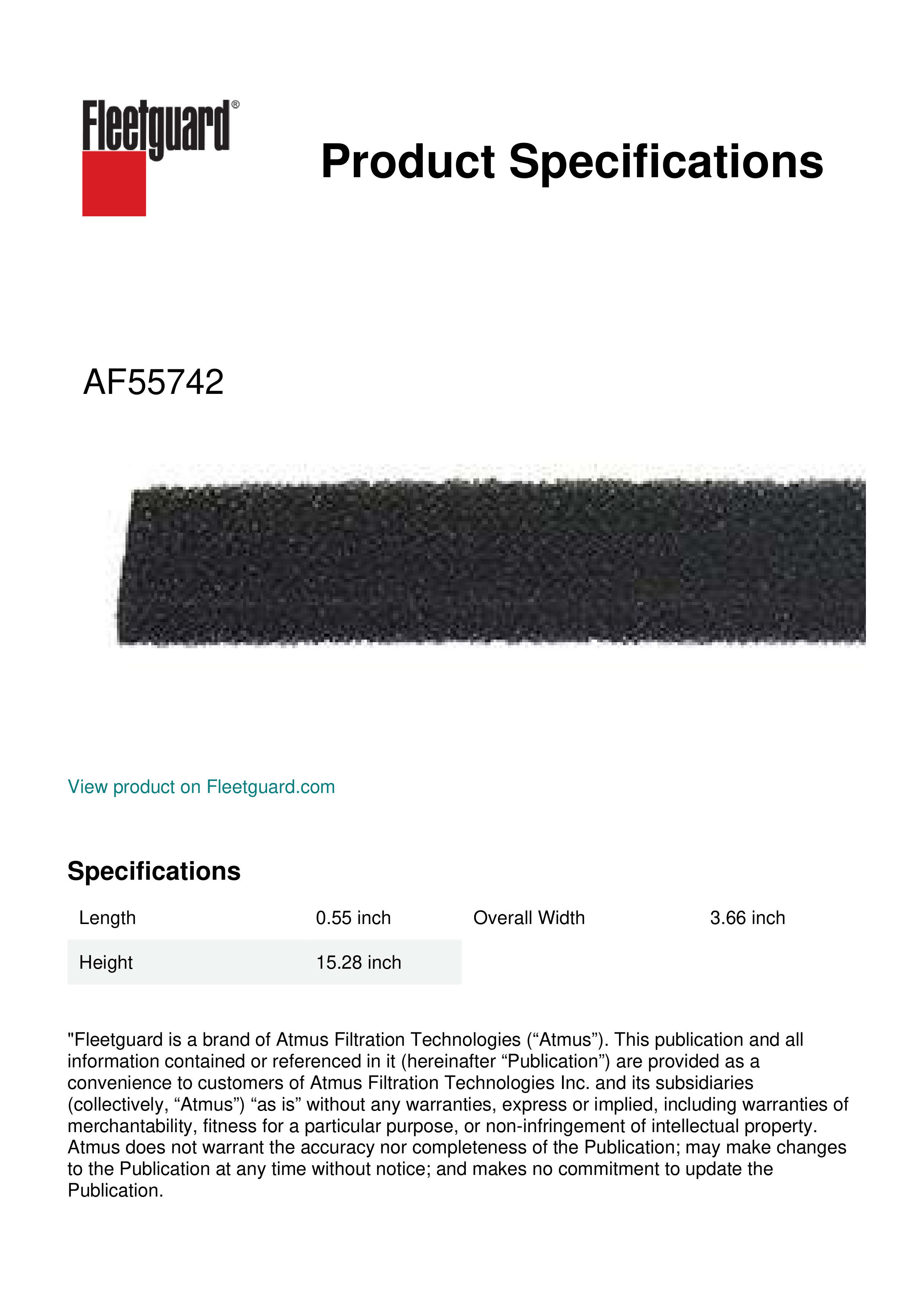 Fleetguard® AF55742 panel cabin air filter provides clean air in the cab which means a clean work environment. Breathing cleaner air can lead to longer and more productive working hours.Specification