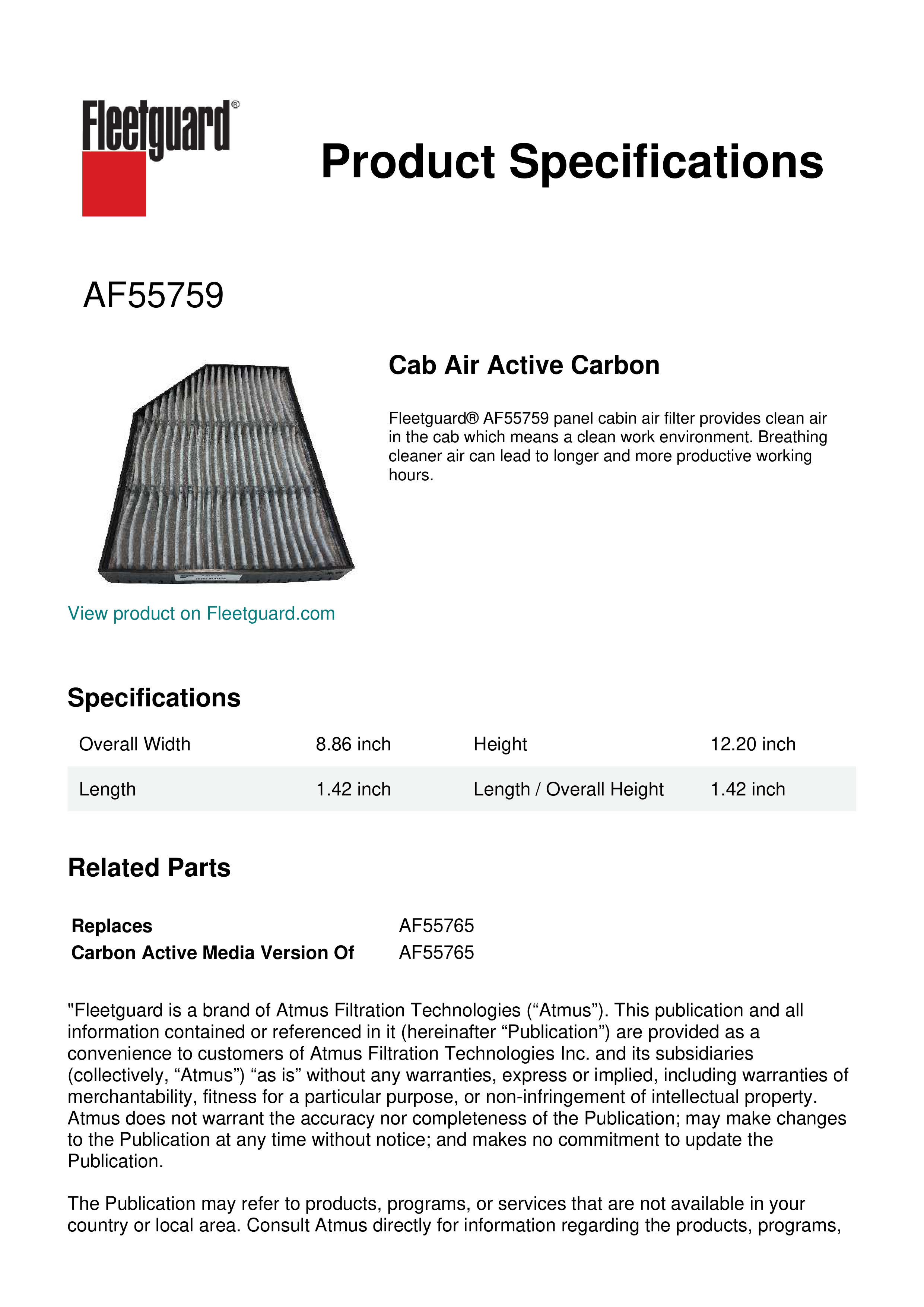 Fleetguard® AF55759 panel cabin air filter provides clean air in the cab which means a clean work environment. Breathing cleaner air can lead to longer and more productive working hours.Specification