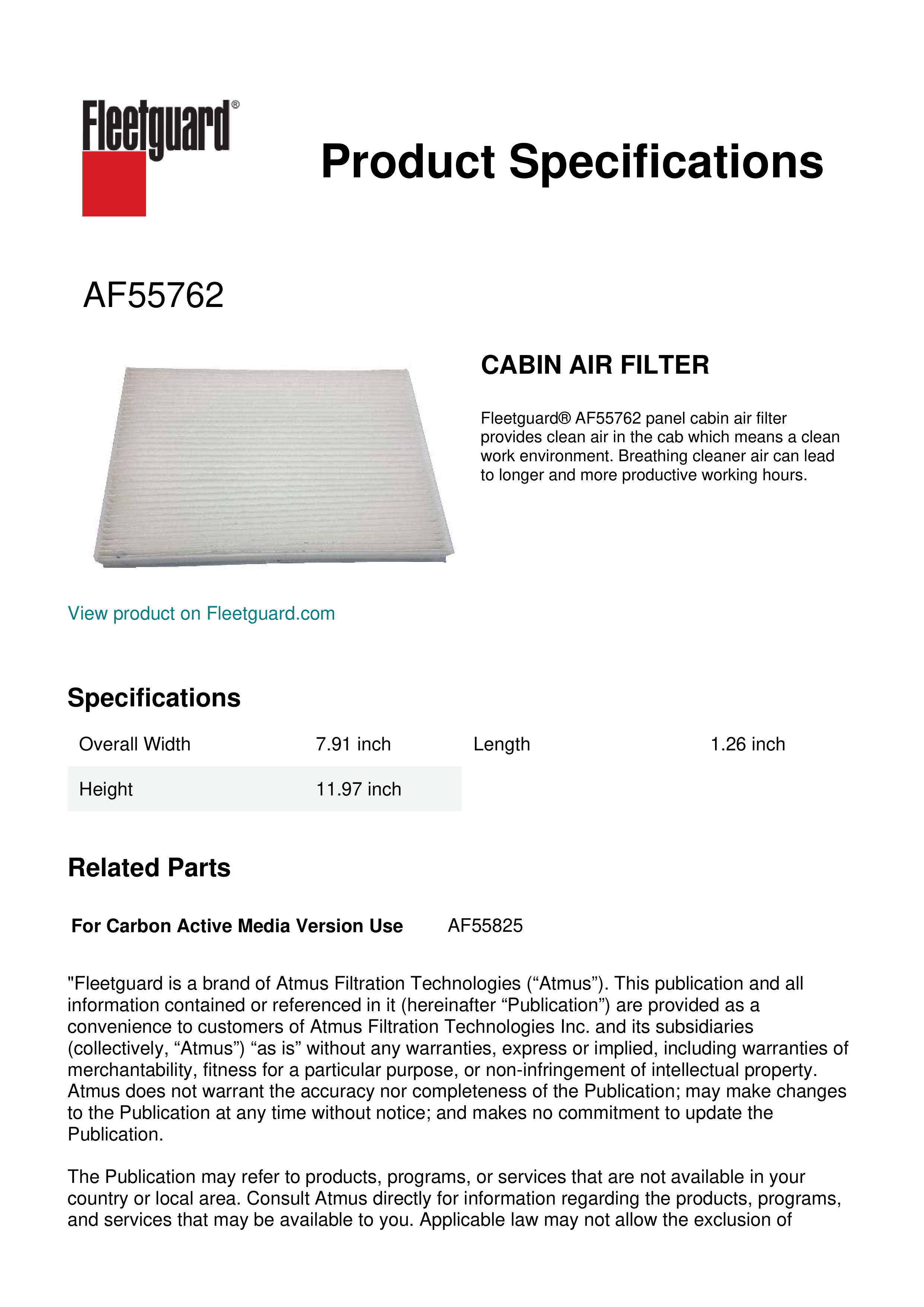 Fleetguard® AF55762 panel cabin air filter provides clean air in the cab which means a clean work environment. Breathing cleaner air can lead to longer and more productive working hours.Specification