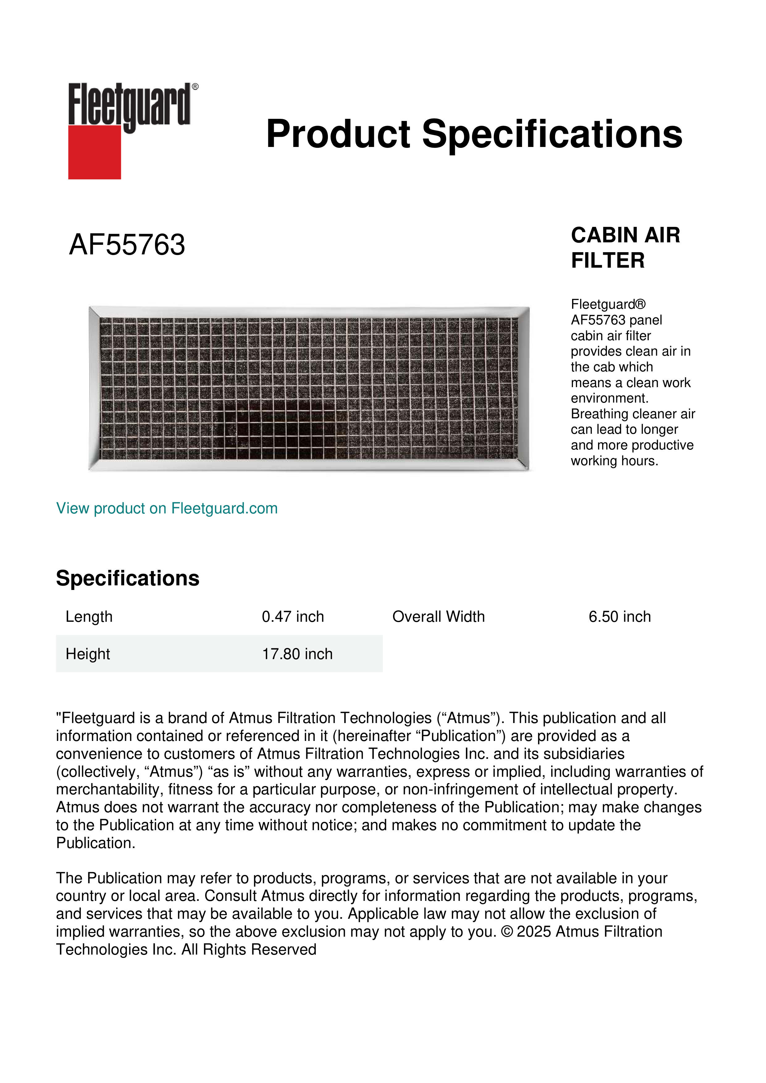 Fleetguard® AF55763 panel cabin air filter provides clean air in the cab which means a clean work environment. Breathing cleaner air can lead to longer and more productive working hours.Specification