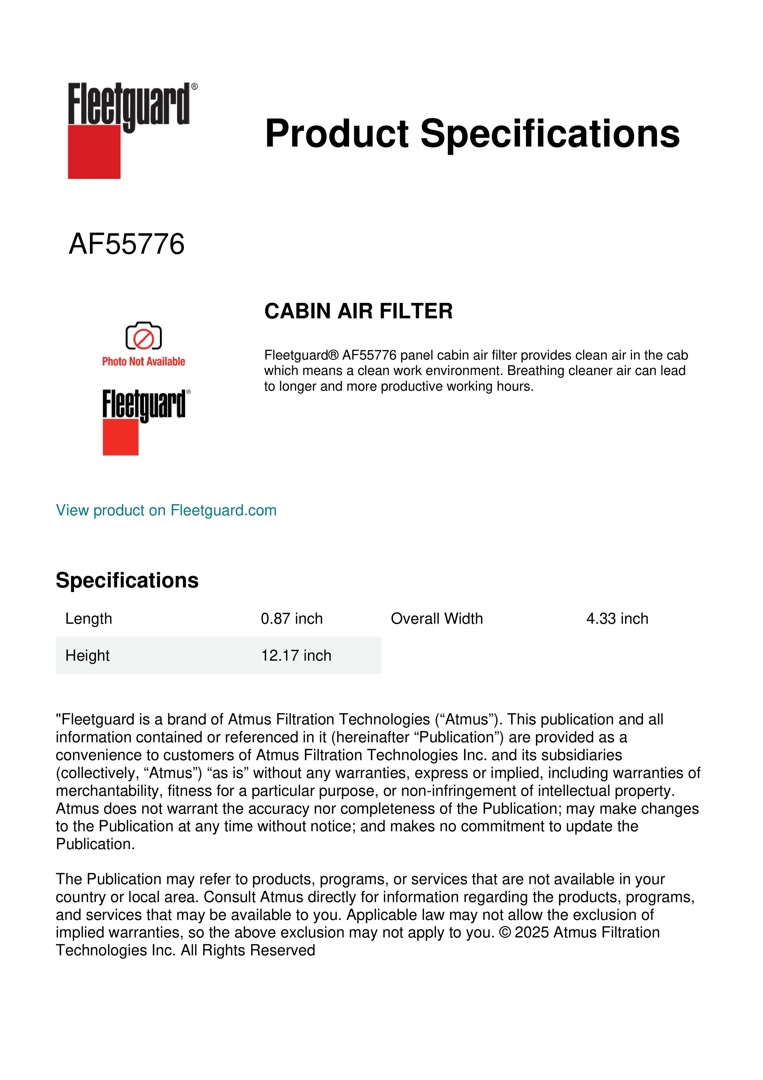 Fleetguard® AF55776 panel cabin air filter provides clean air in the cab which means a clean work environment. Breathing cleaner air can lead to longer and more productive working hours.Specification
