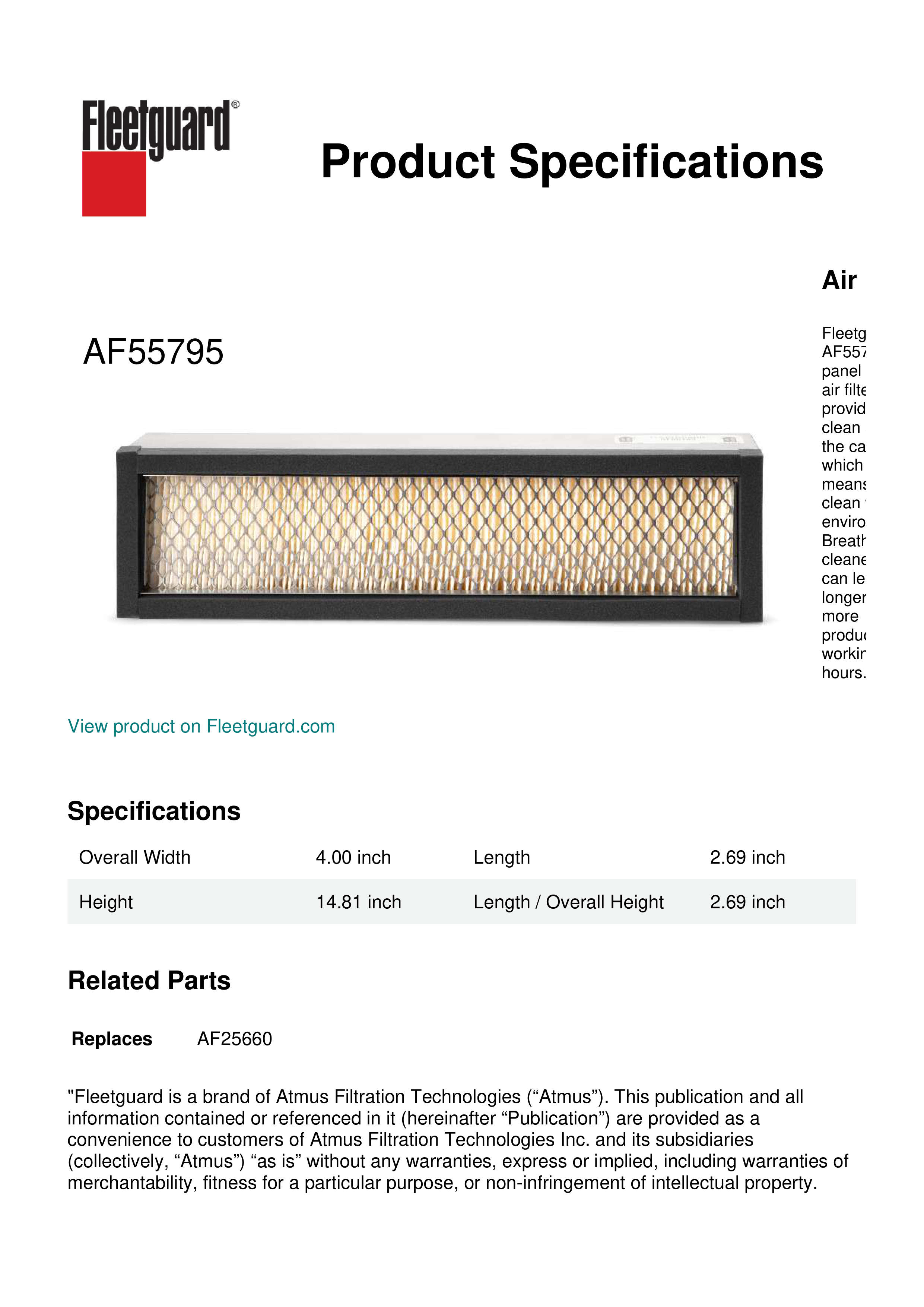 Fleetguard® AF55795 panel cabin air filter provides clean air in the cab which means a clean work environment. Breathing cleaner air can lead to longer and more productive working hours.Specification