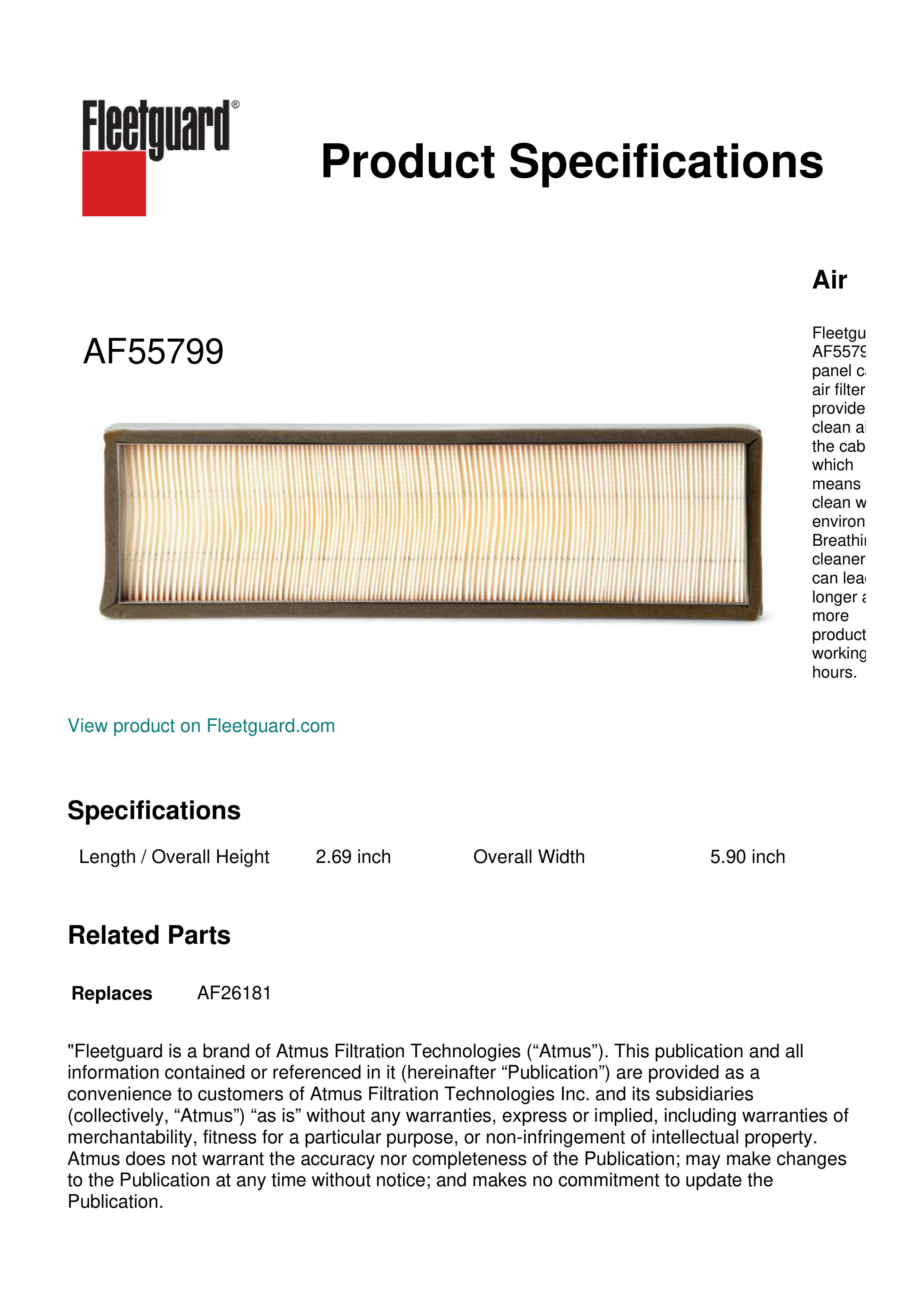 Fleetguard® AF55799 panel cabin air filter provides clean air in the cab which means a clean work environment. Breathing cleaner air can lead to longer and more productive working hours.Specification