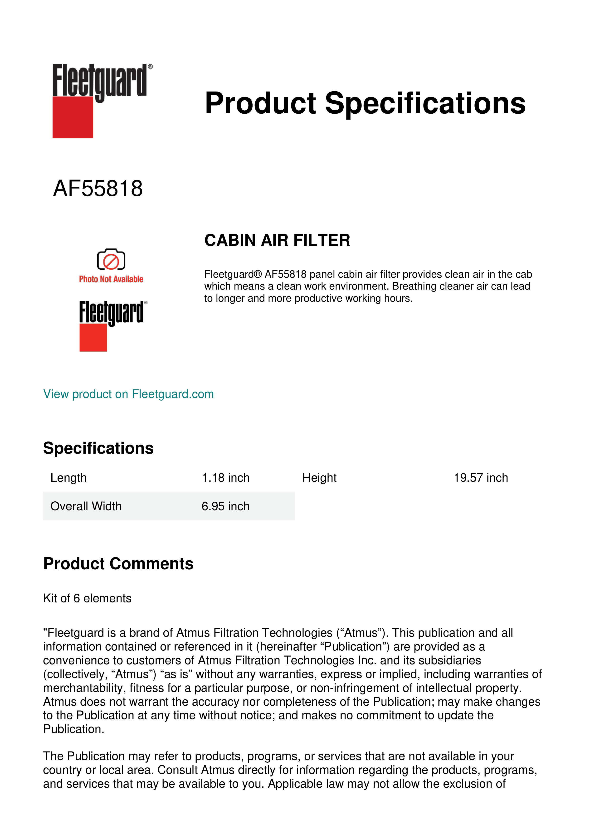 Fleetguard® AF55818 panel cabin air filter provides clean air in the cab which means a clean work environment. Breathing cleaner air can lead to longer and more productive working hours.Specification
