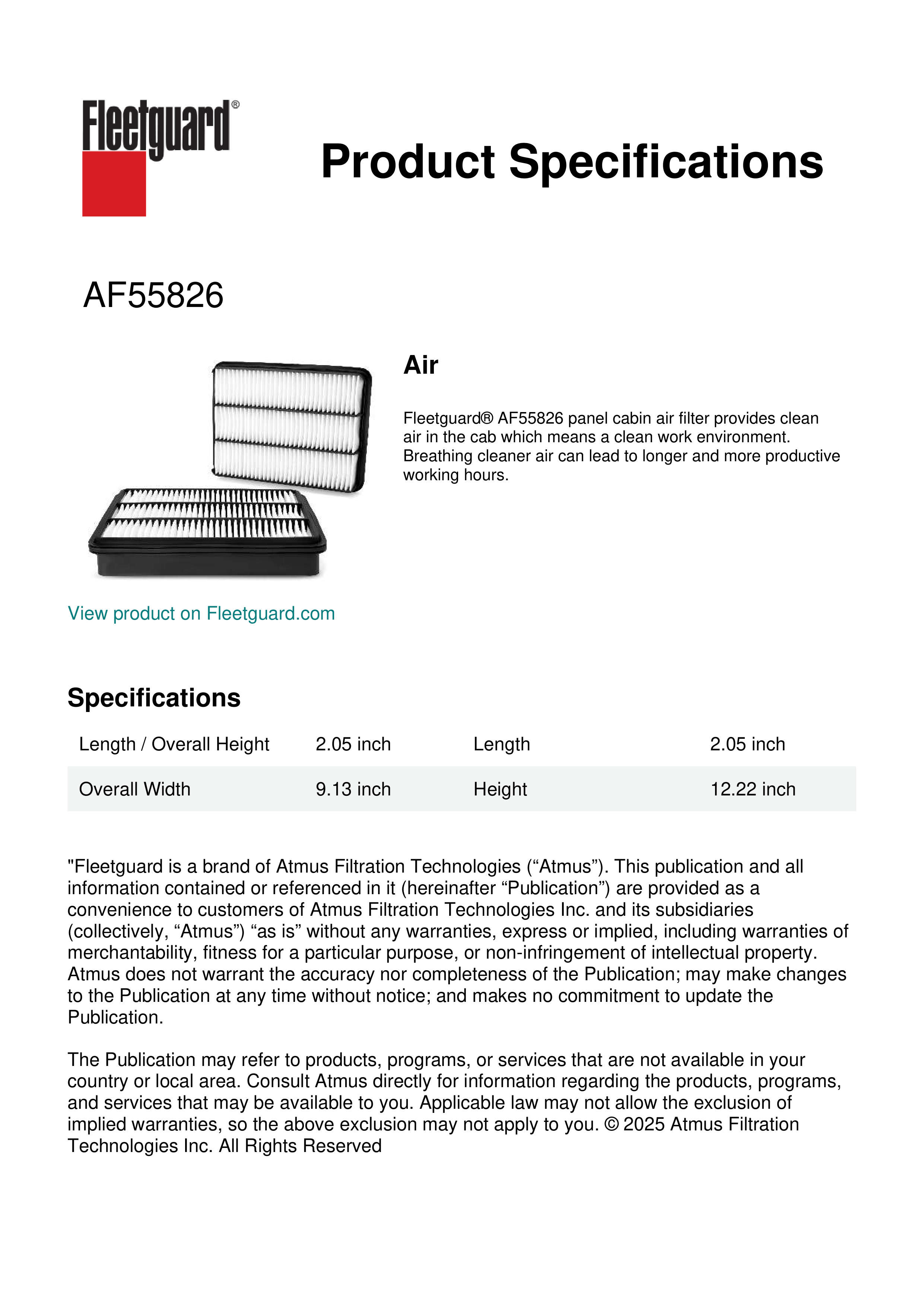 Fleetguard® AF55826 panel cabin air filter provides clean air in the cab which means a clean work environment. Breathing cleaner air can lead to longer and more productive working hours.Specification