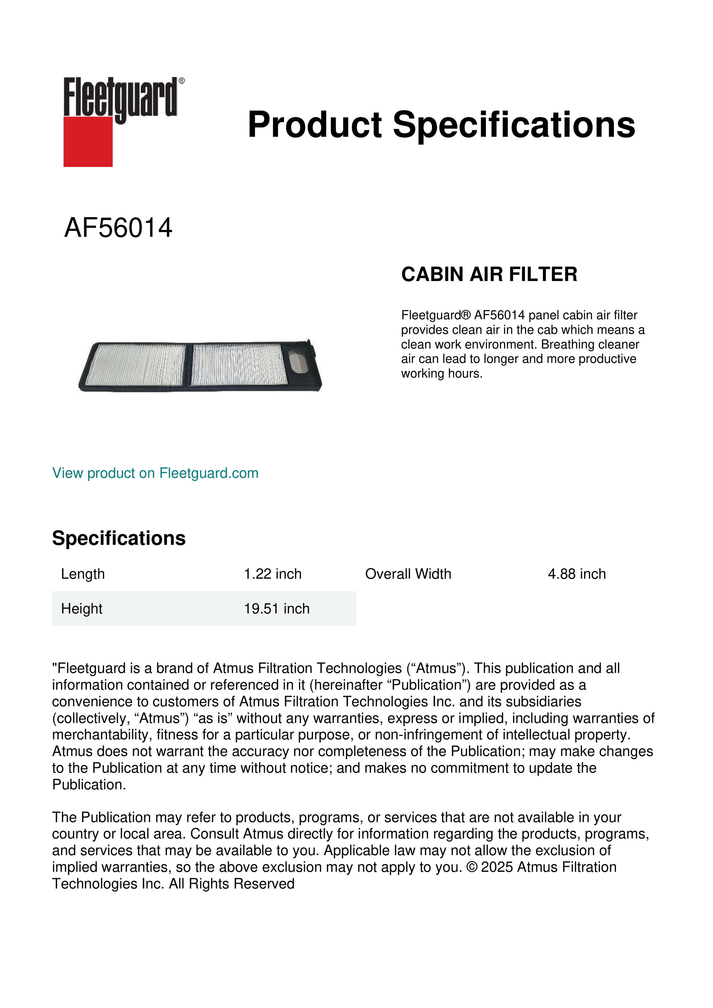 Fleetguard® AF56014 panel cabin air filter provides clean air in the cab which means a clean work environment. Breathing cleaner air can lead to longer and more productive working hours.Specification
