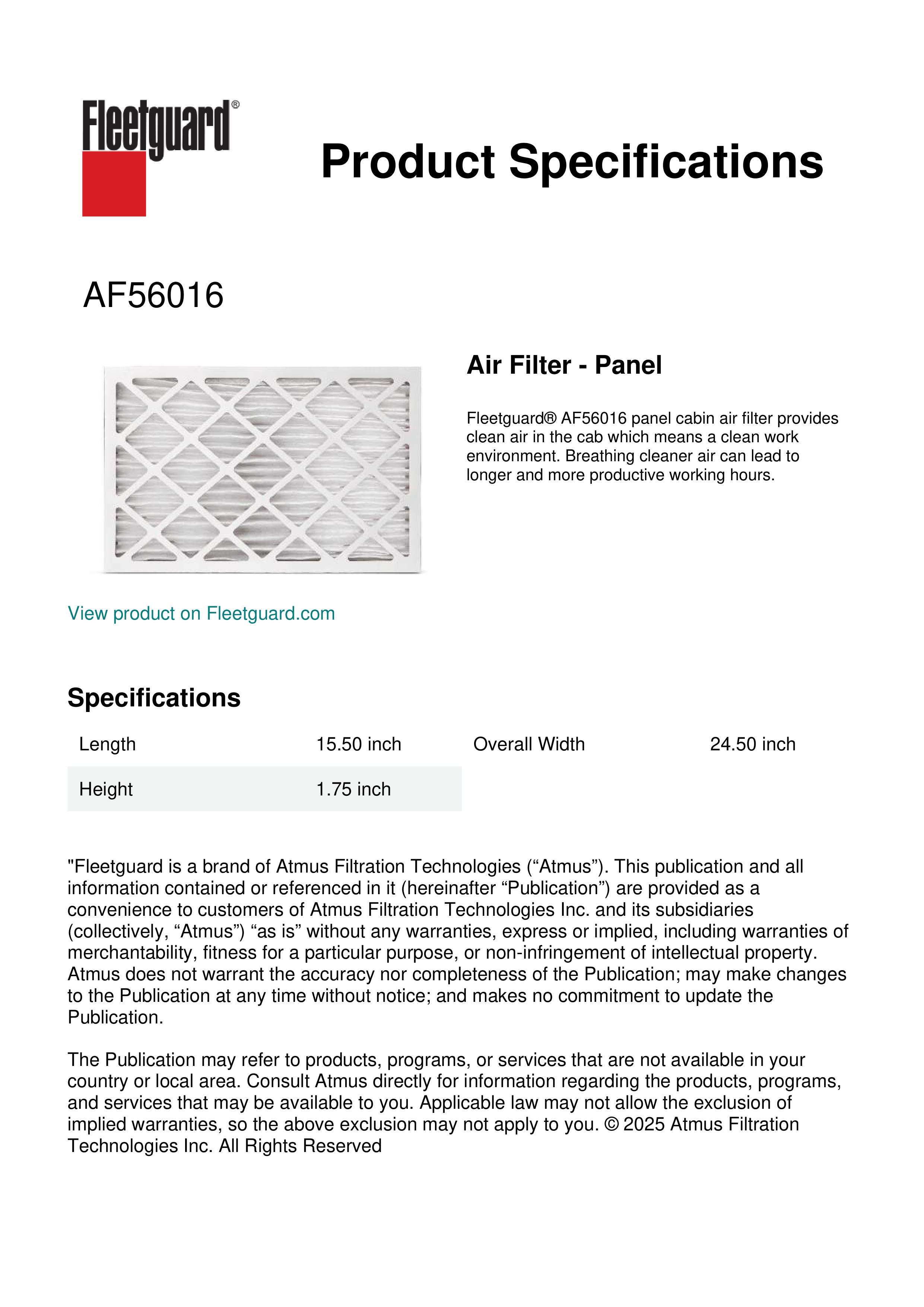 Fleetguard® AF56016 panel cabin air filter provides clean air in the cab which means a clean work environment. Breathing cleaner air can lead to longer and more productive working hours.Specification