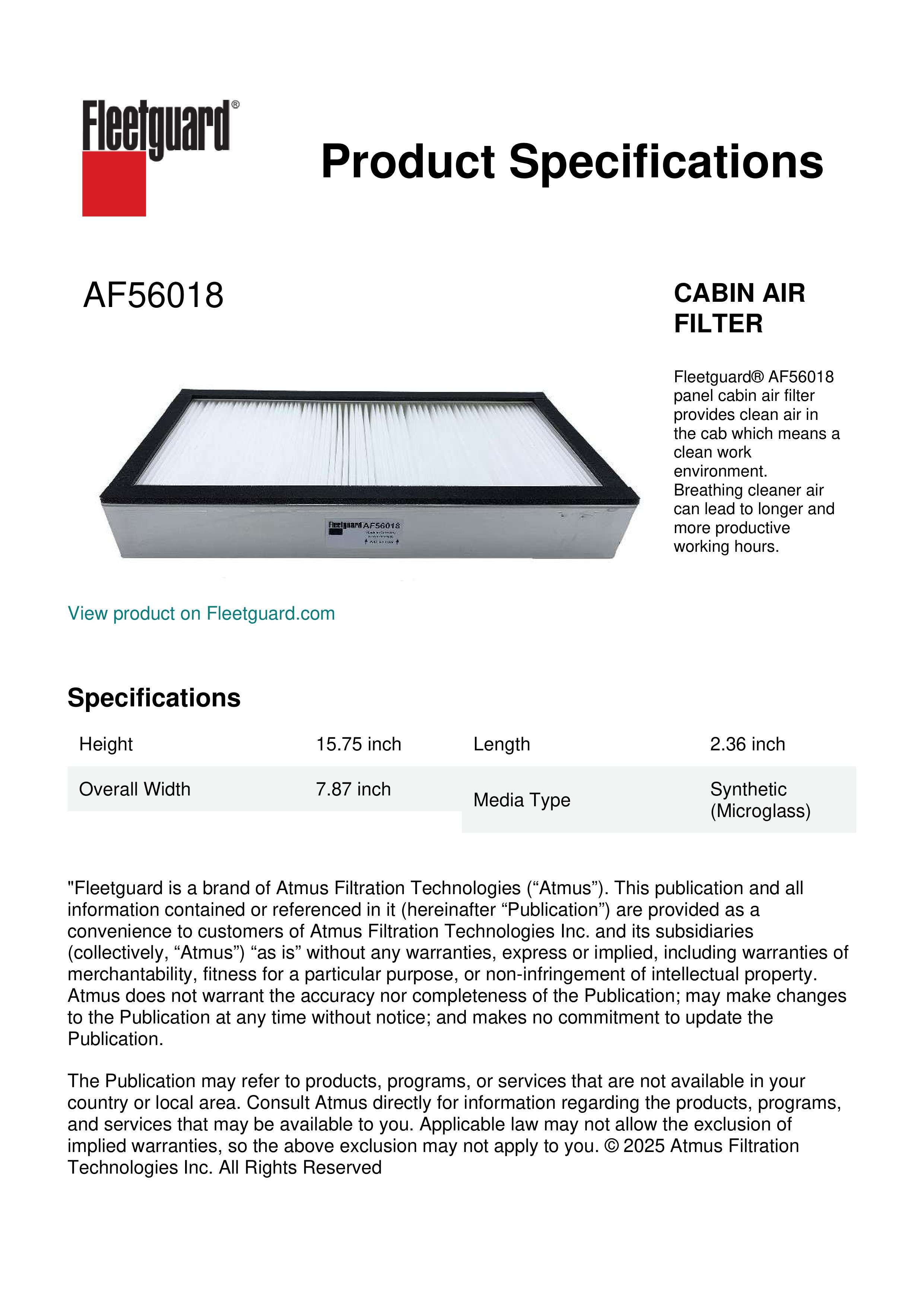Fleetguard® AF56018 panel cabin air filter provides clean air in the cab which means a clean work environment. Breathing cleaner air can lead to longer and more productive working hours.Specification