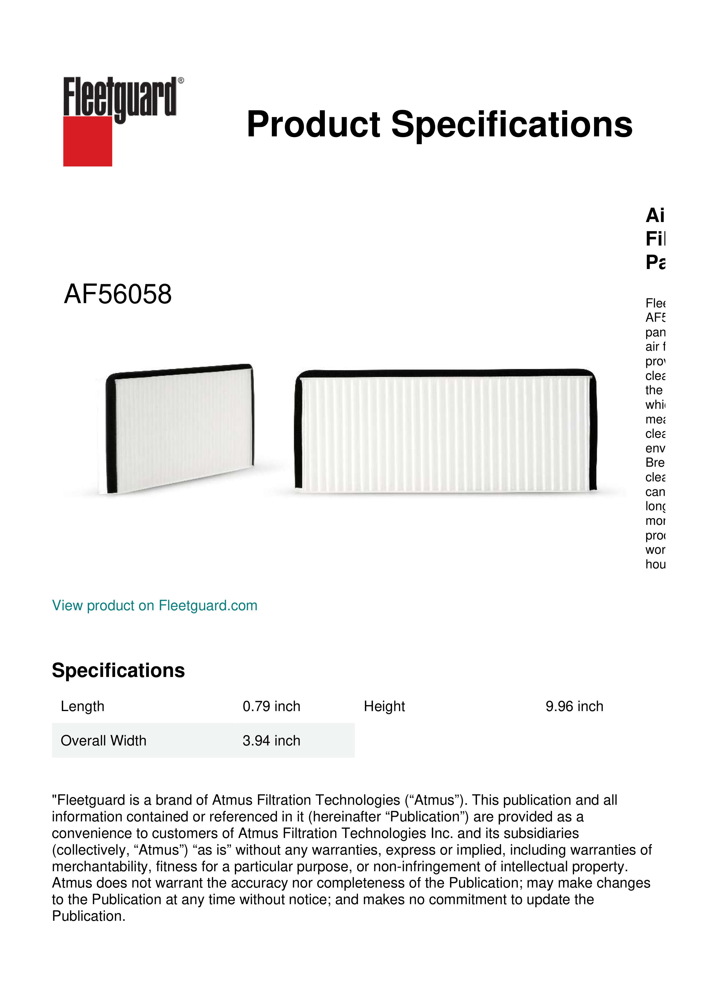 Fleetguard® AF56058 panel cabin air filter provides clean air in the cab which means a clean work environment. Breathing cleaner air can lead to longer and more productive working hours.Specification
