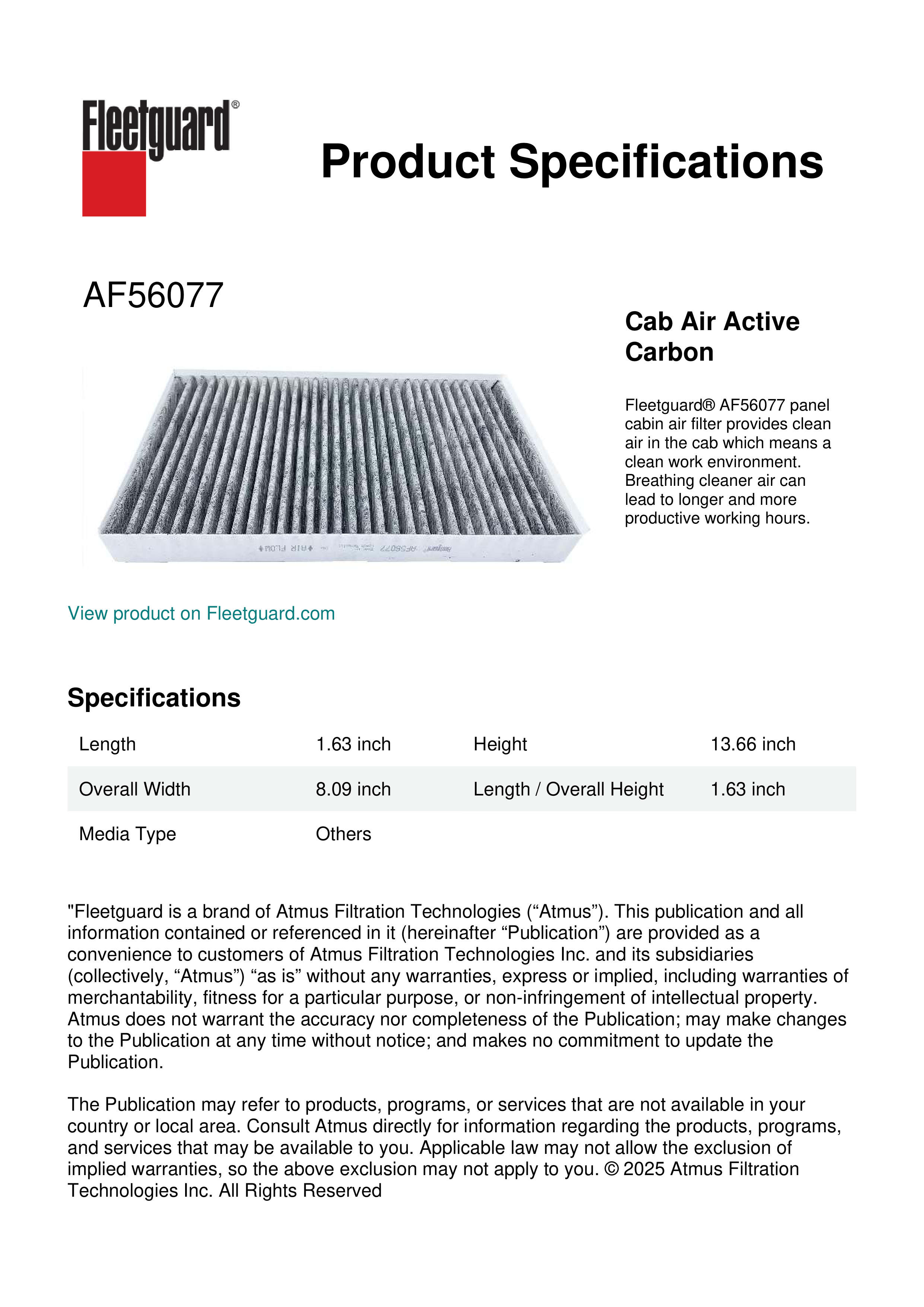 Fleetguard® AF56077 panel cabin air filter provides clean air in the cab which means a clean work environment. Breathing cleaner air can lead to longer and more productive working hours.Specification