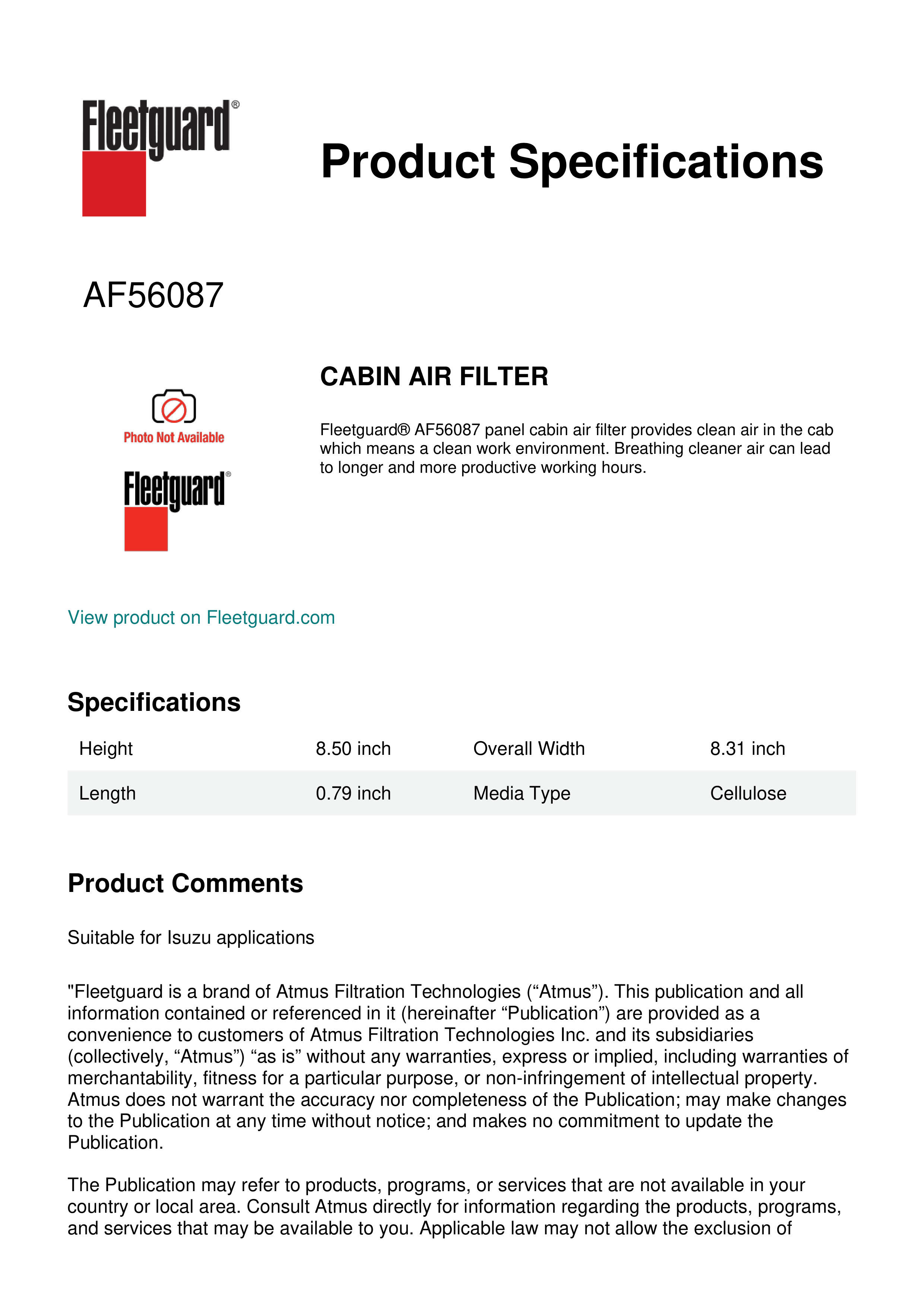 Fleetguard® AF56087 panel cabin air filter provides clean air in the cab which means a clean work environment. Breathing cleaner air can lead to longer and more productive working hours.Specification