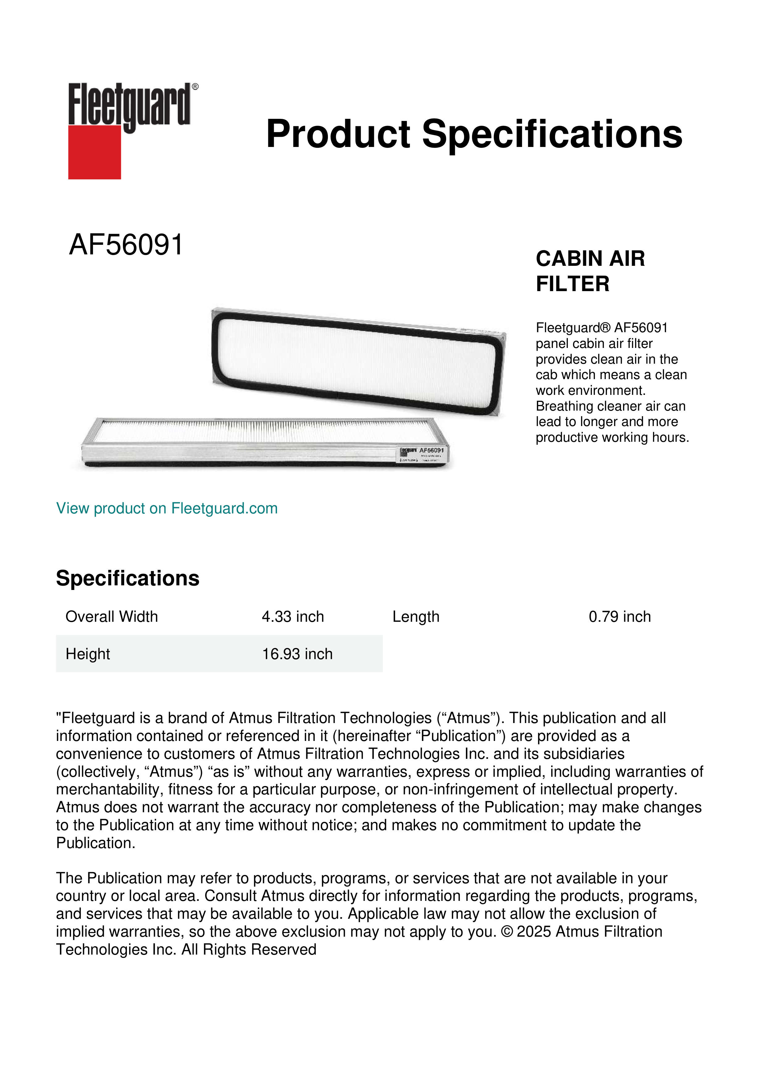 Fleetguard® AF56091 panel cabin air filter provides clean air in the cab which means a clean work environment. Breathing cleaner air can lead to longer and more productive working hours.Specification