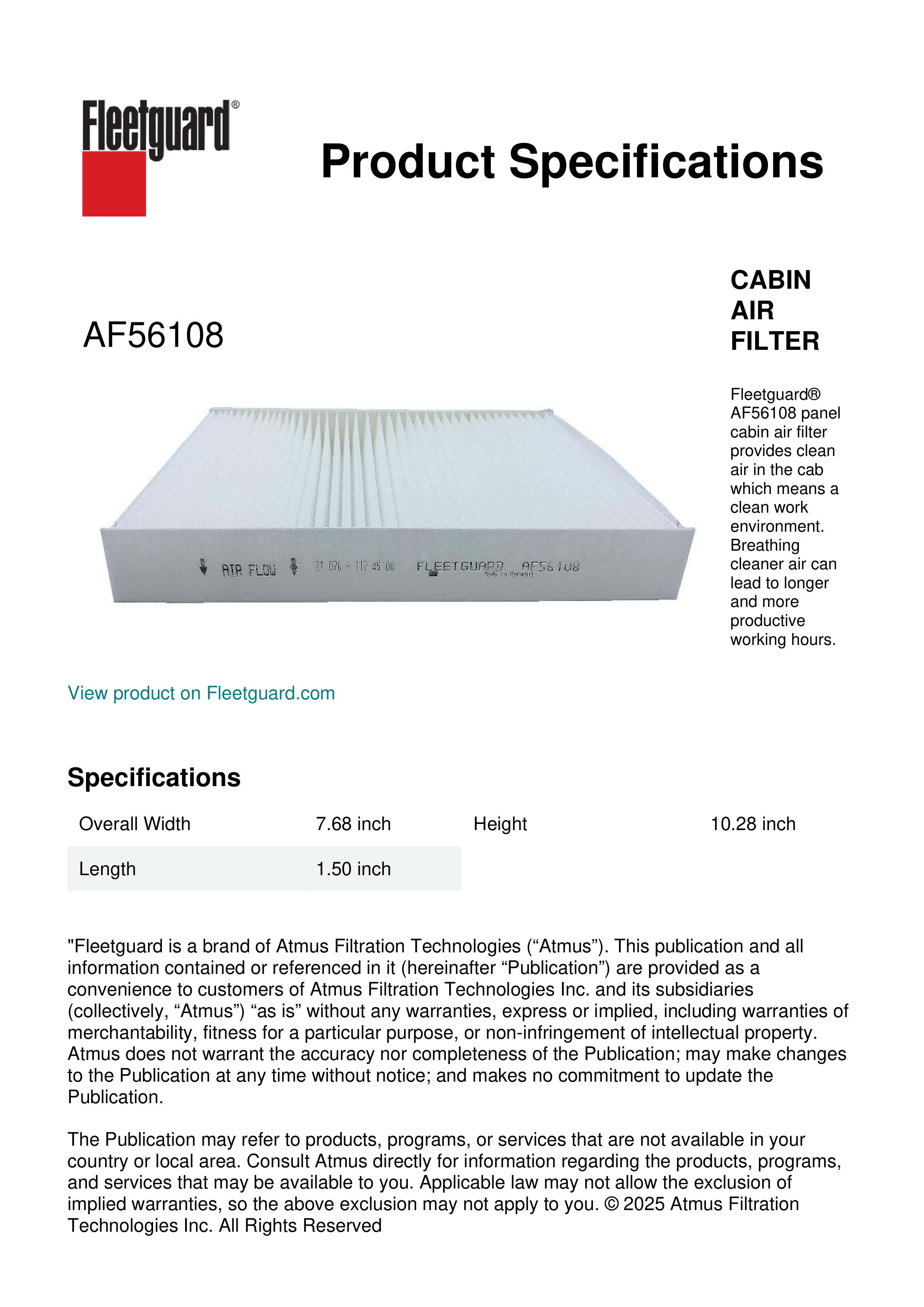 Fleetguard® AF56108 panel cabin air filter provides clean air in the cab which means a clean work environment. Breathing cleaner air can lead to longer and more productive working hours.Specification