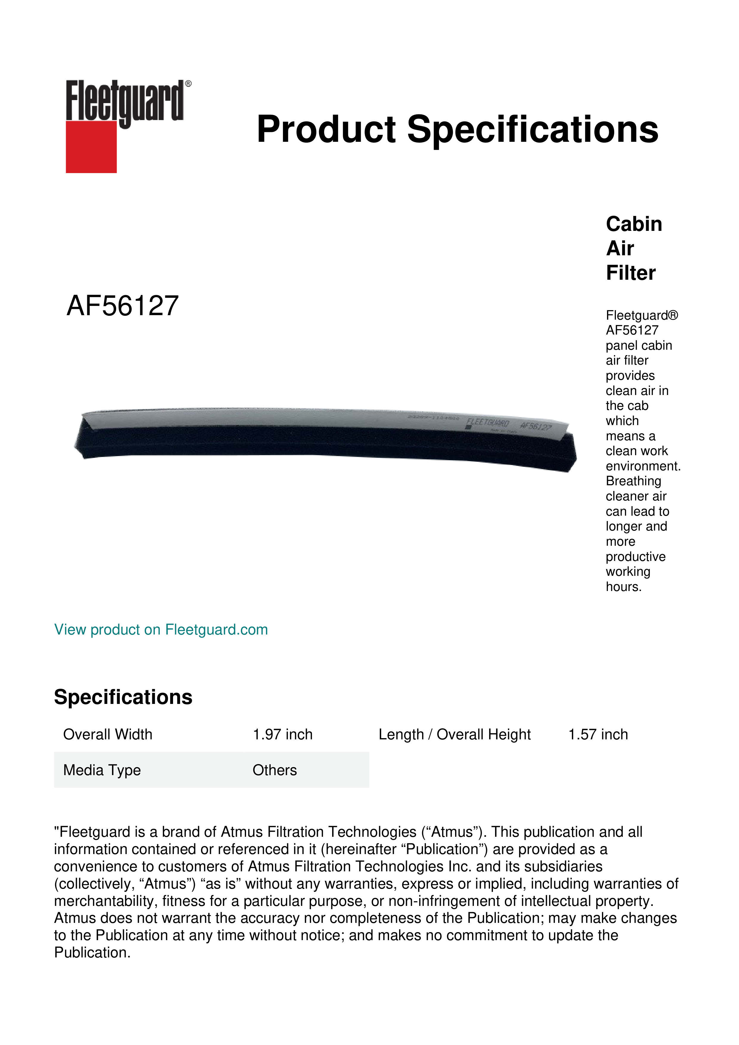 Fleetguard® AF56127 panel cabin air filter provides clean air in the cab which means a clean work environment. Breathing cleaner air can lead to longer and more productive working hours.Specification