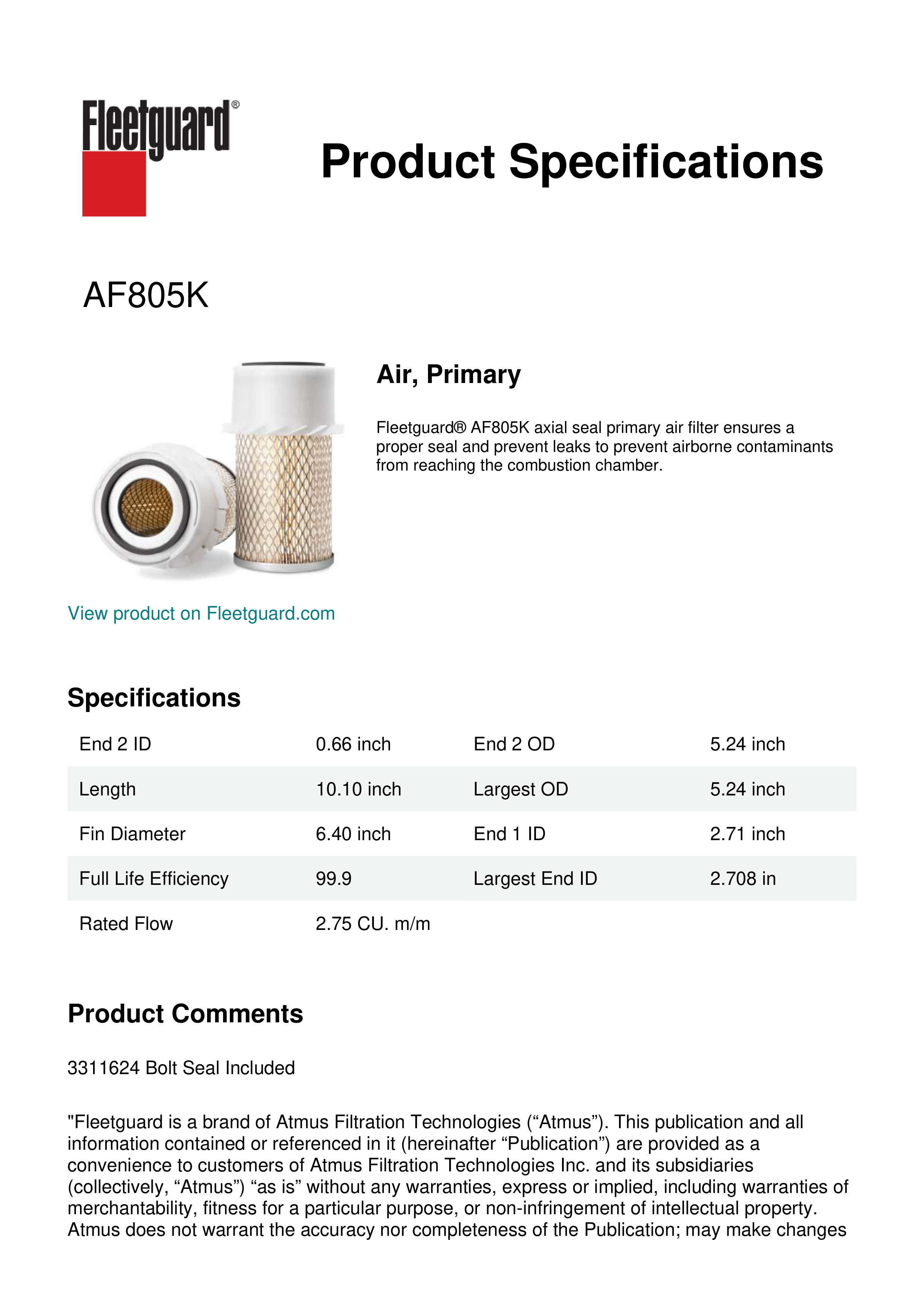 Fleetguard® AF805K axial seal primary air filter ensures a proper seal and prevent leaks to prevent airborne contaminants from reaching the combustion chamber.