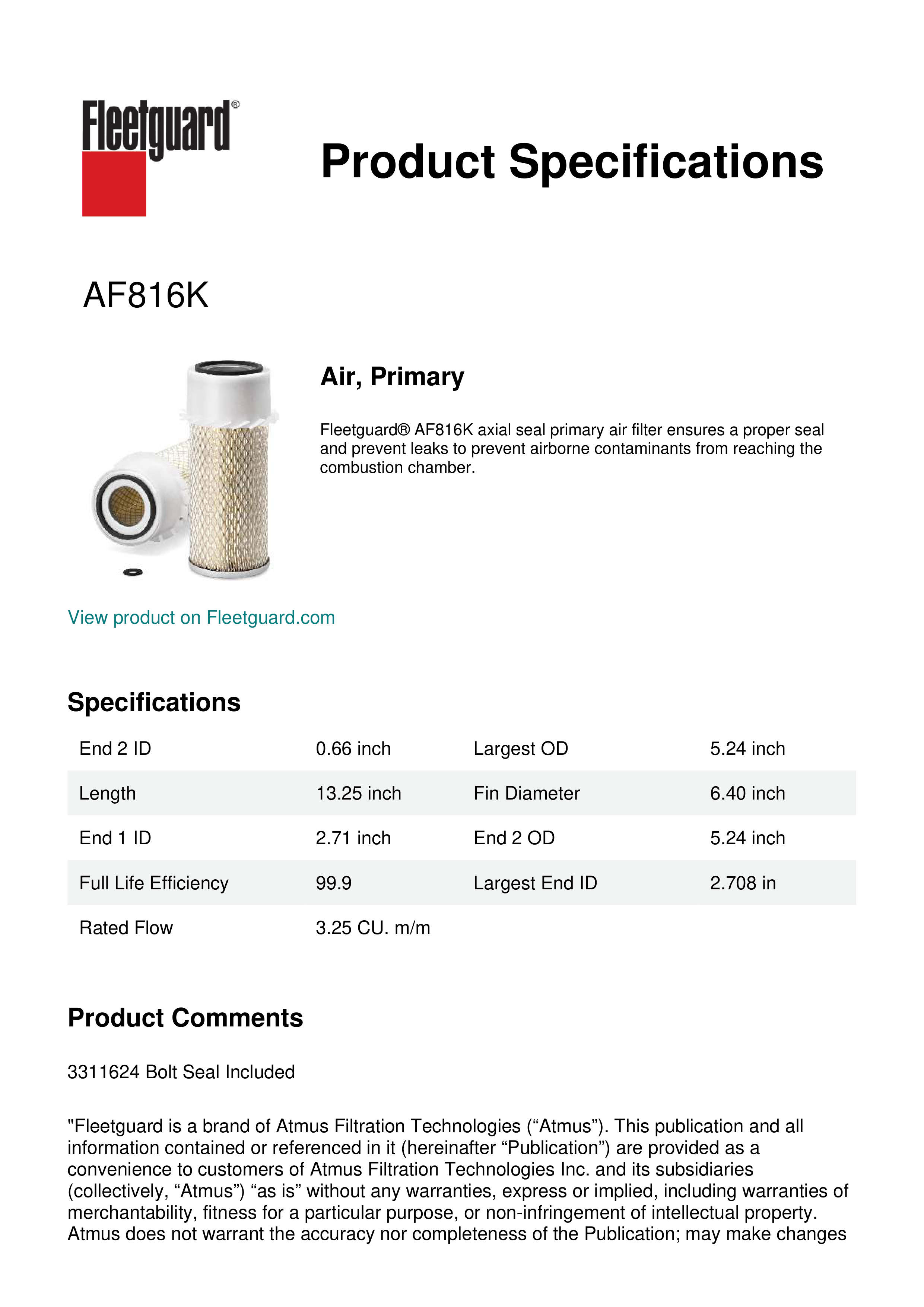 Fleetguard® AF816K axial seal primary air filter ensures a proper seal and prevent leaks to prevent airborne contaminants from reaching the combustion chamber.