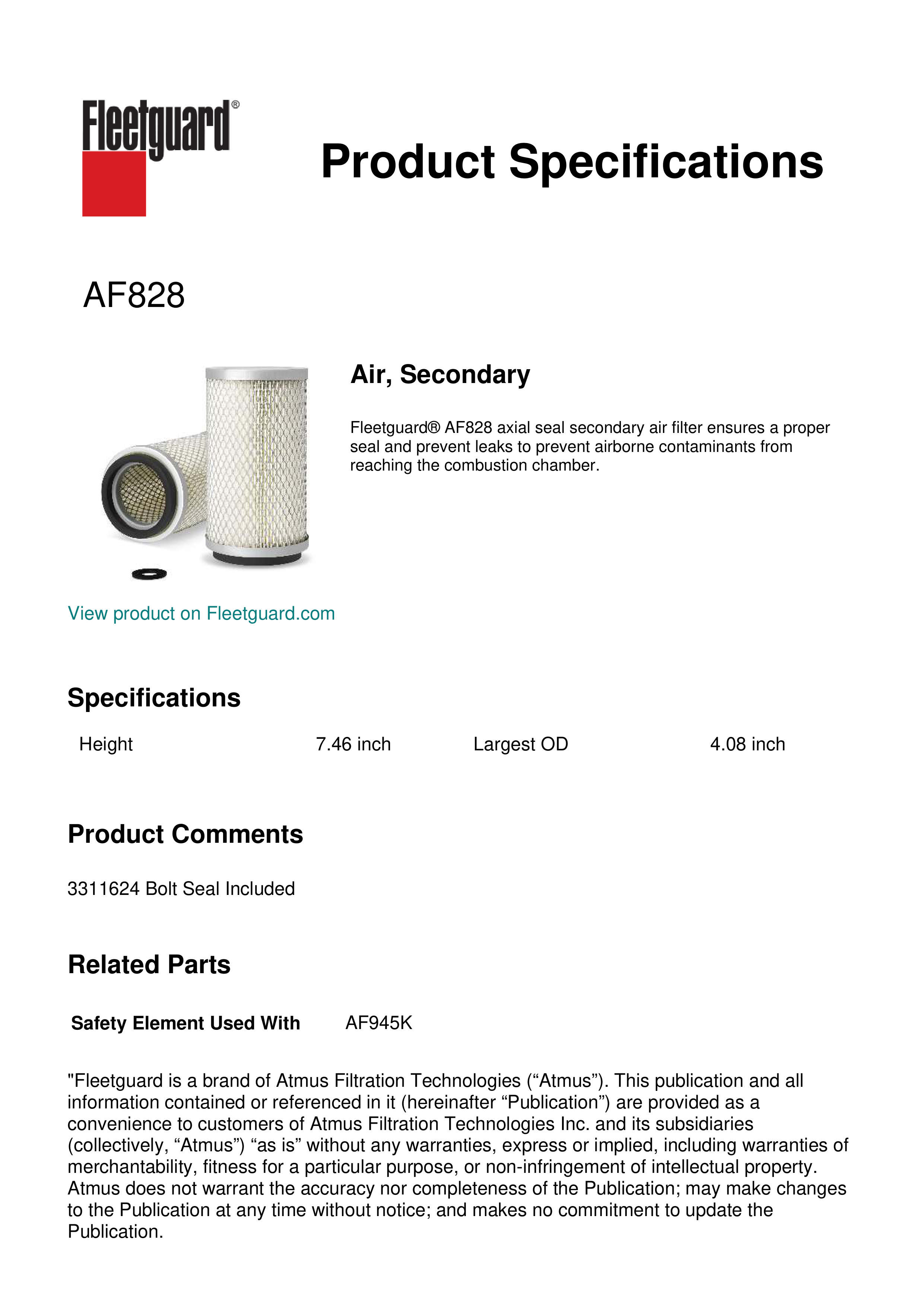Fleetguard® AF828 axial seal secondary air filter ensures a proper seal and prevent leaks to prevent airborne contaminants from reaching the combustion chamber.