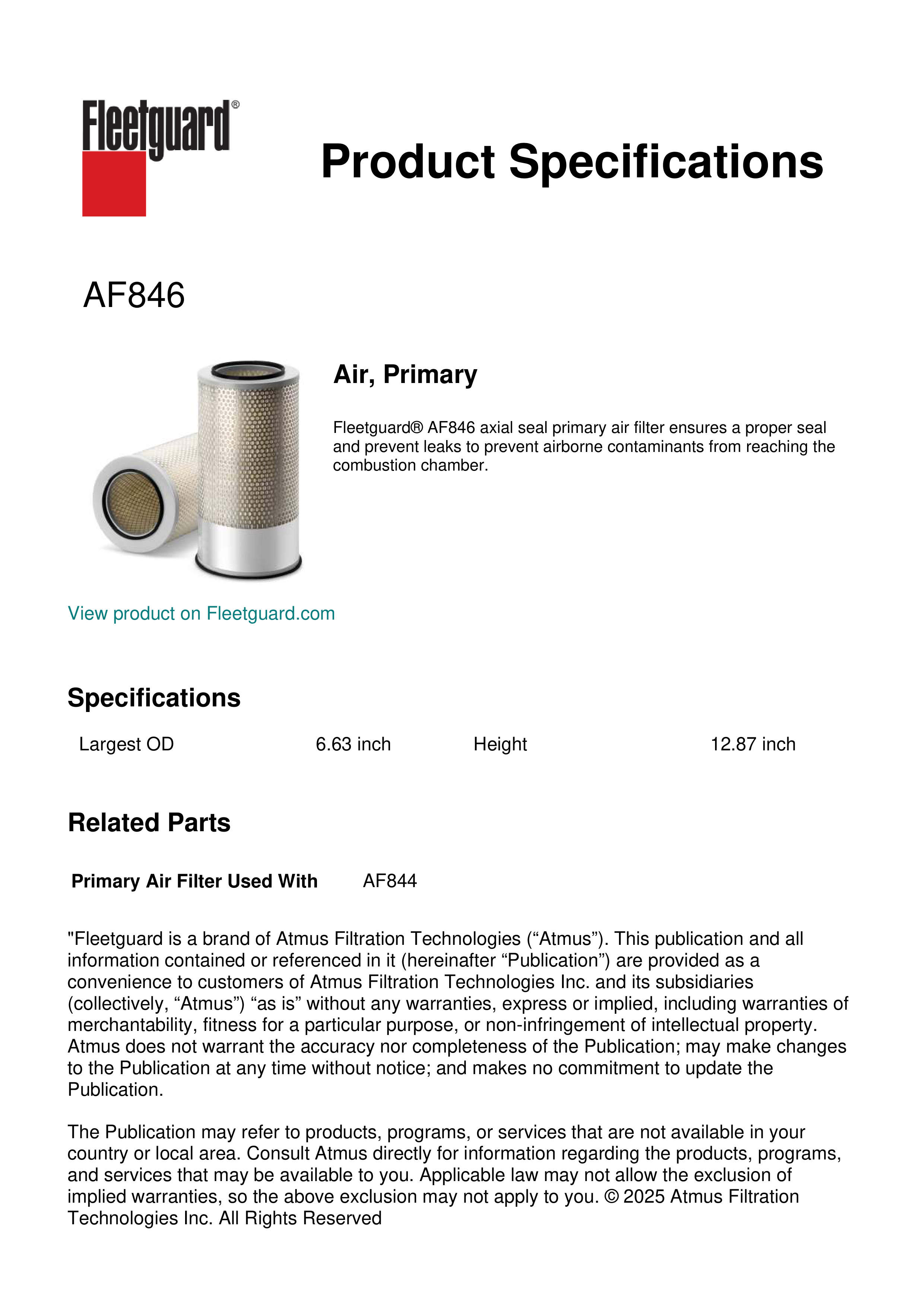 Fleetguard® AF846 axial seal primary air filter ensures a proper seal and prevent leaks to prevent airborne contaminants from reaching the combustion chamber.Specification