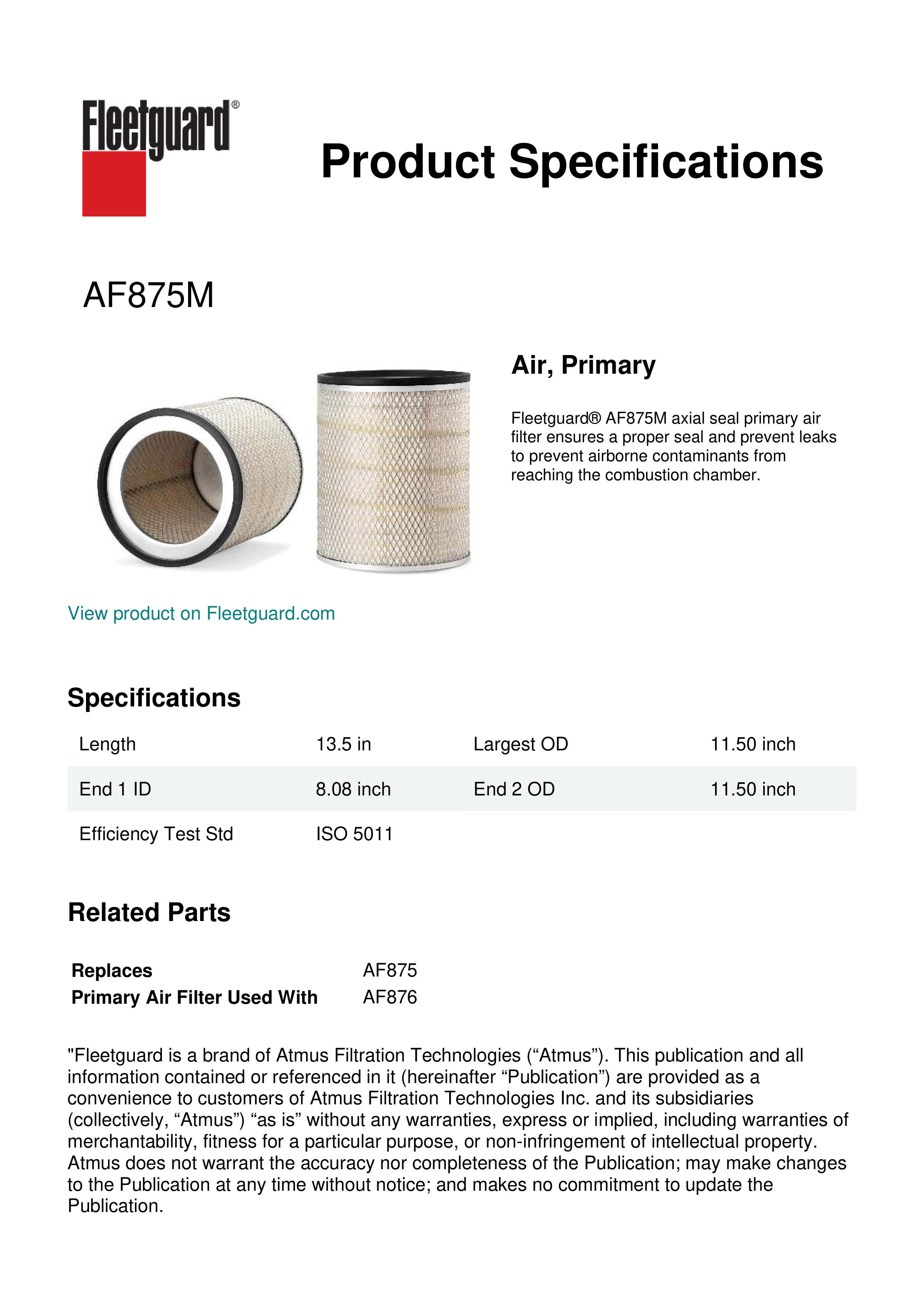 Fleetguard® AF875M axial seal primary air filter ensures a proper seal and prevent leaks to prevent airborne contaminants from reaching the combustion chamber.Specification