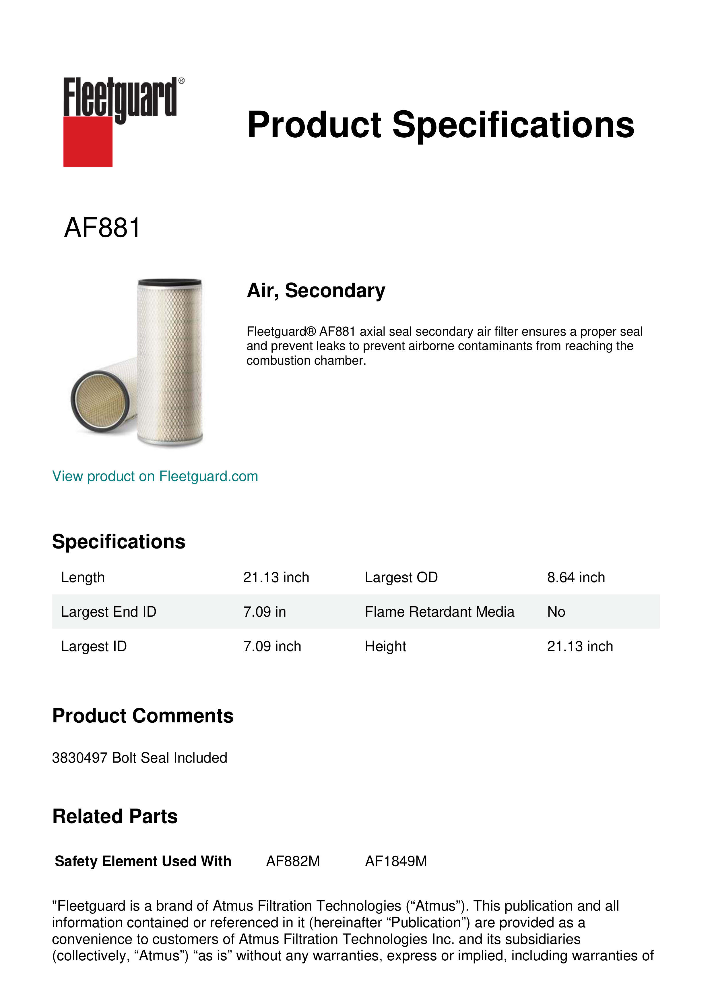 Fleetguard® AF881 axial seal secondary air filter ensures a proper seal and prevent leaks to prevent airborne contaminants from reaching the combustion chamber.