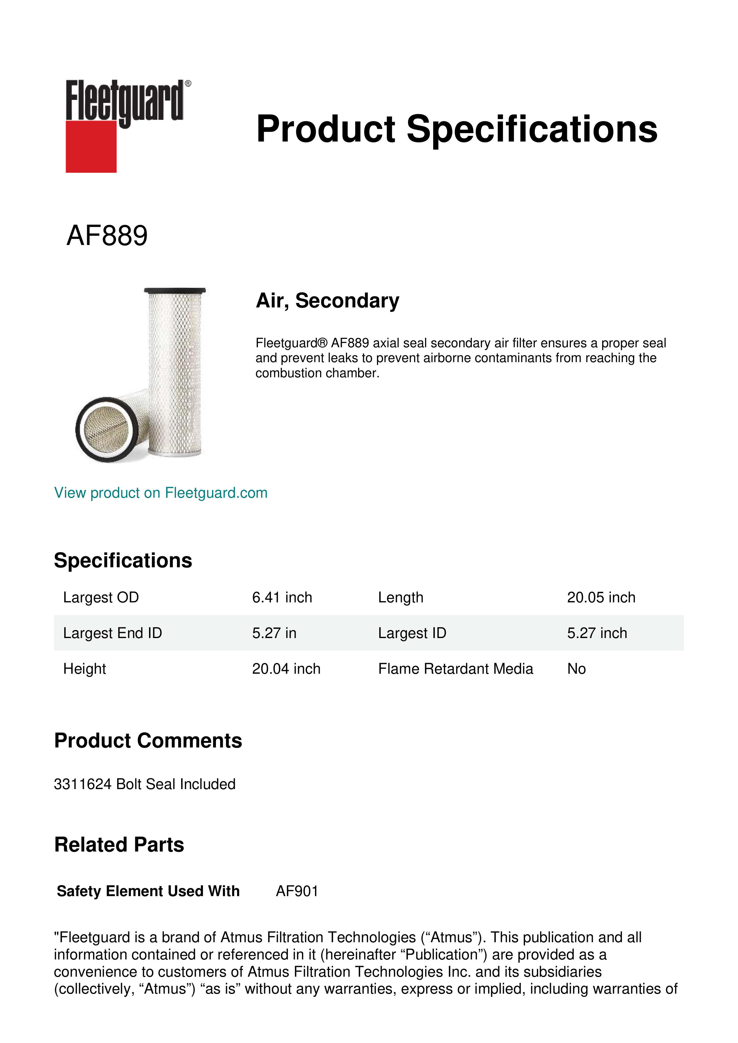 Fleetguard® AF889 axial seal secondary air filter ensures a proper seal and prevent leaks to prevent airborne contaminants from reaching the combustion chamber.Specification