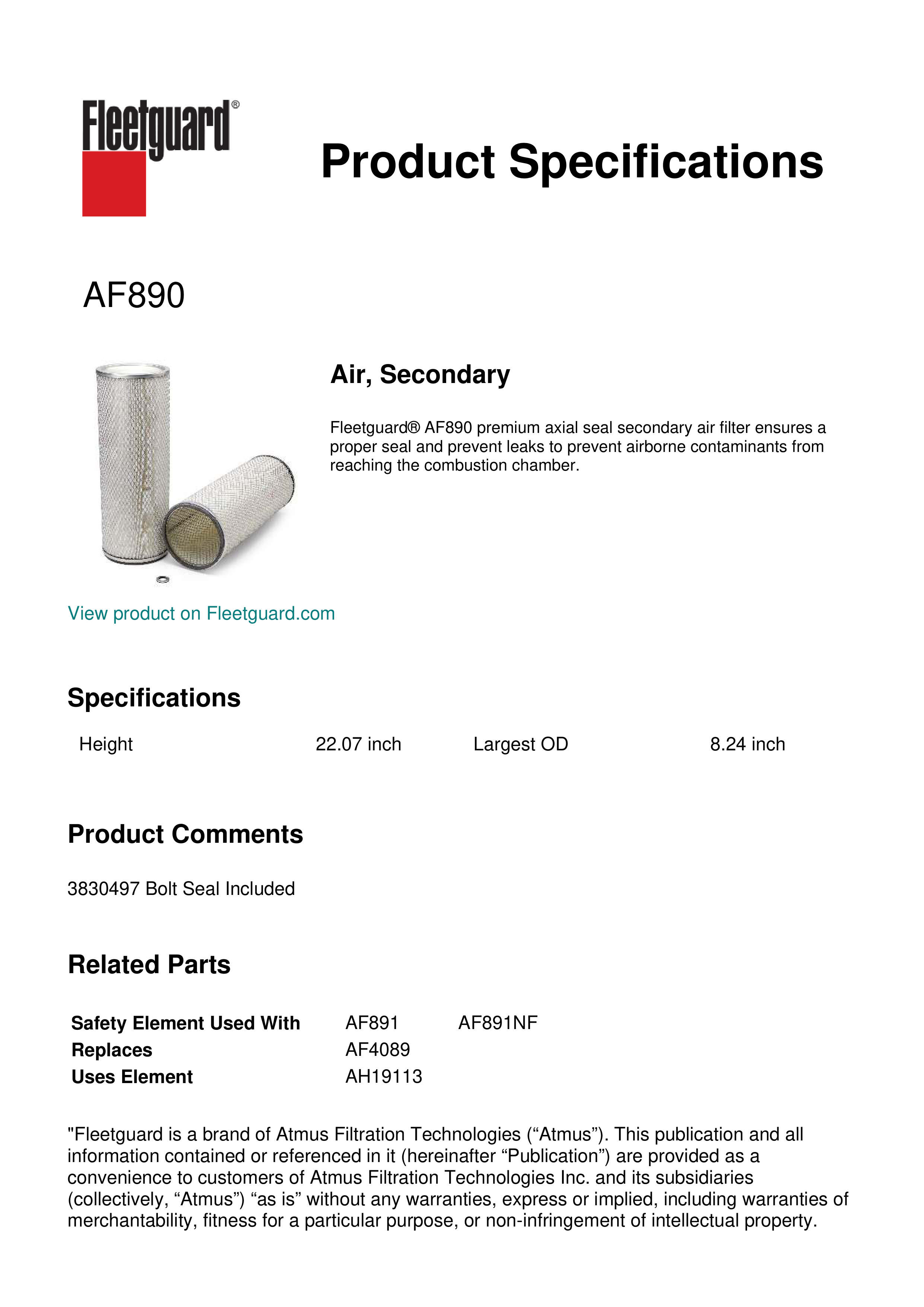 Fleetguard® AF890 premium axial seal secondary air filter ensures a proper seal and prevent leaks to prevent airborne contaminants from reaching the combustion chamber.Specification