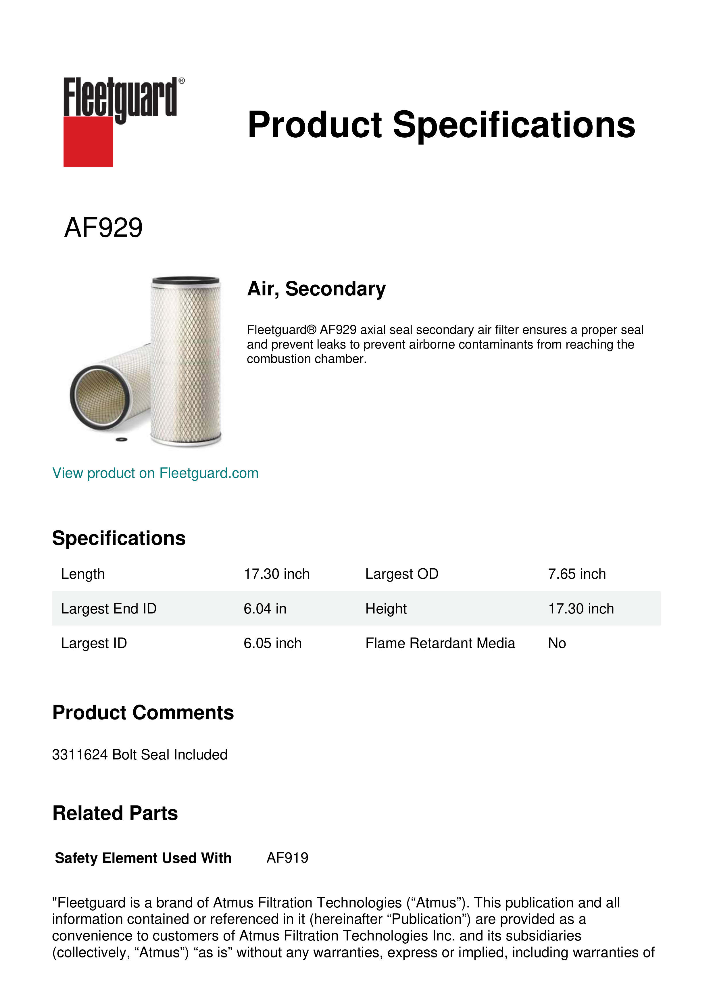 Fleetguard® AF929 axial seal secondary air filter ensures a proper seal and prevent leaks to prevent airborne contaminants from reaching the combustion chamber.