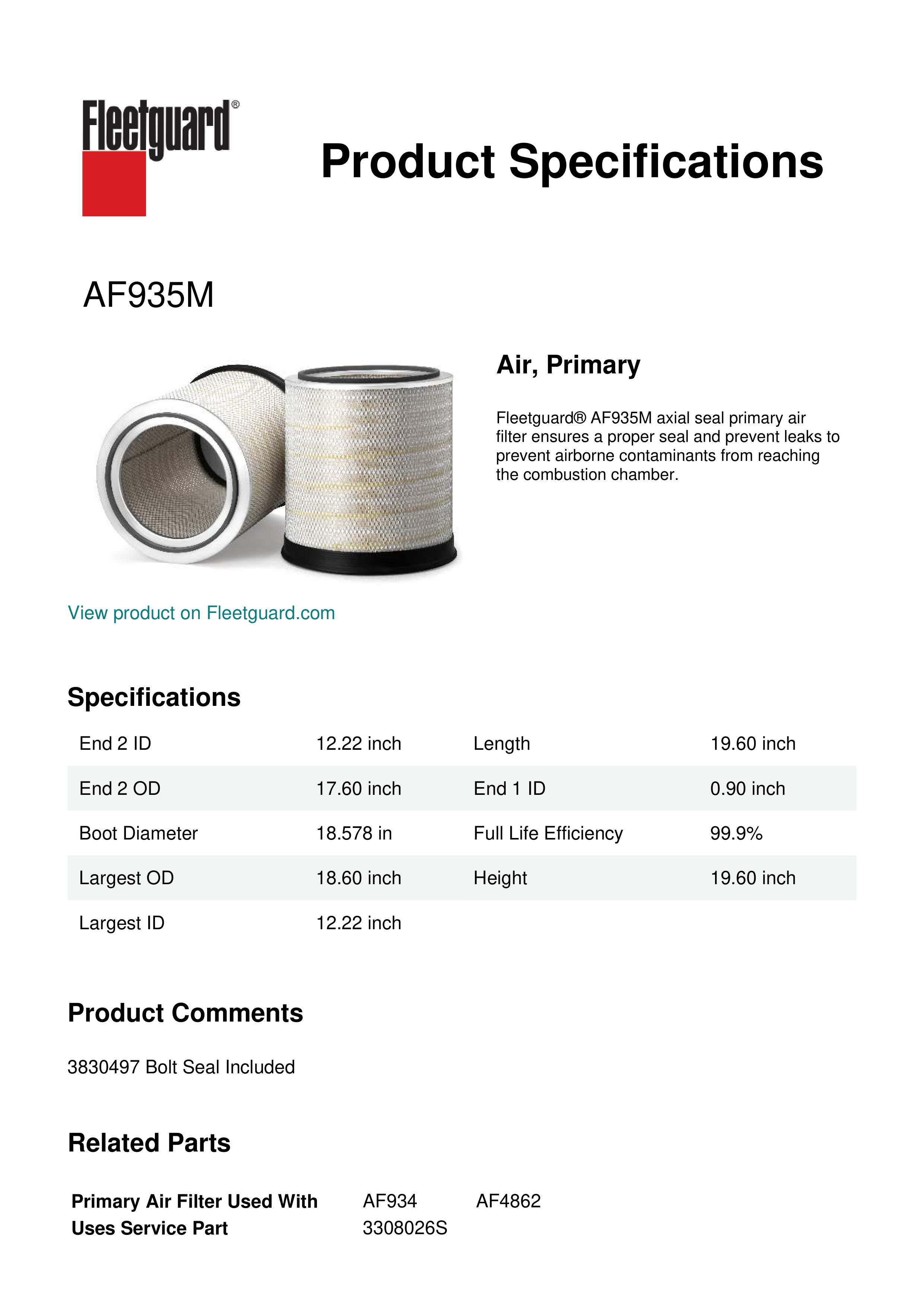 Fleetguard® AF935M axial seal primary air filter ensures a proper seal and prevent leaks to prevent airborne contaminants from reaching the combustion chamber.