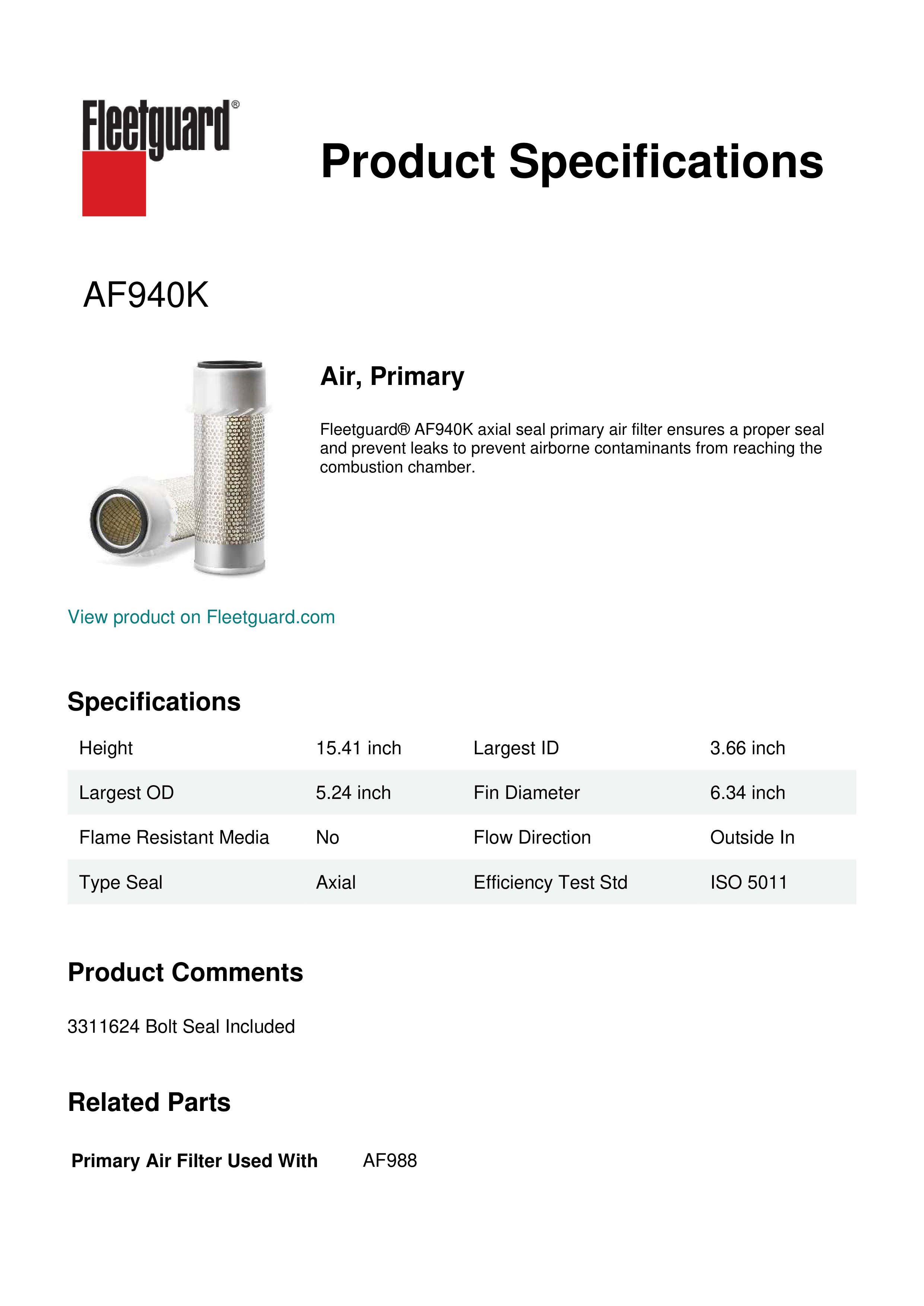 Fleetguard® AF940K axial seal primary air filter ensures a proper seal and prevent leaks to prevent airborne contaminants from reaching the combustion chamber.Specification