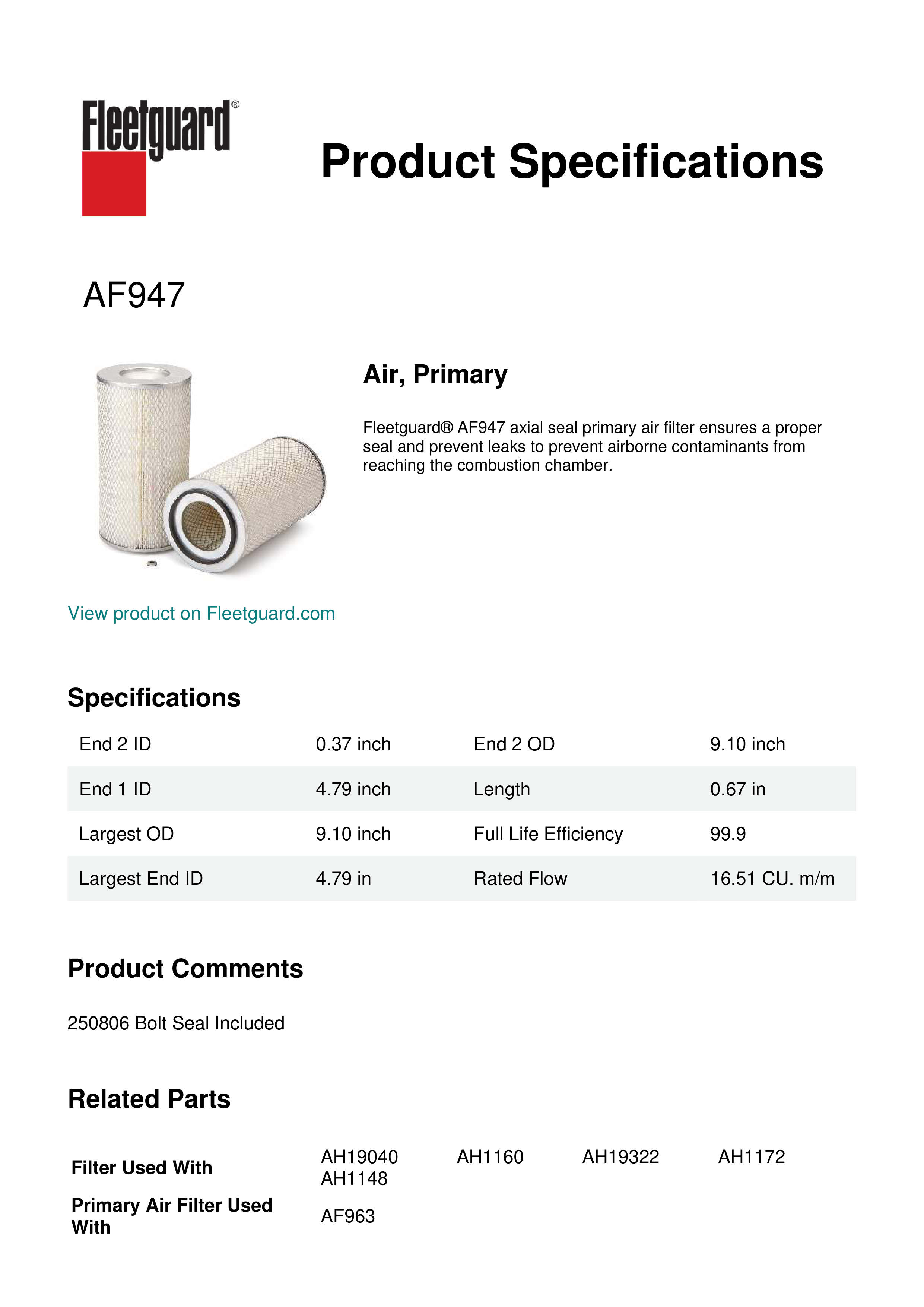 Fleetguard® AF947 axial seal primary air filter ensures a proper seal and prevent leaks to prevent airborne contaminants from reaching the combustion chamber.