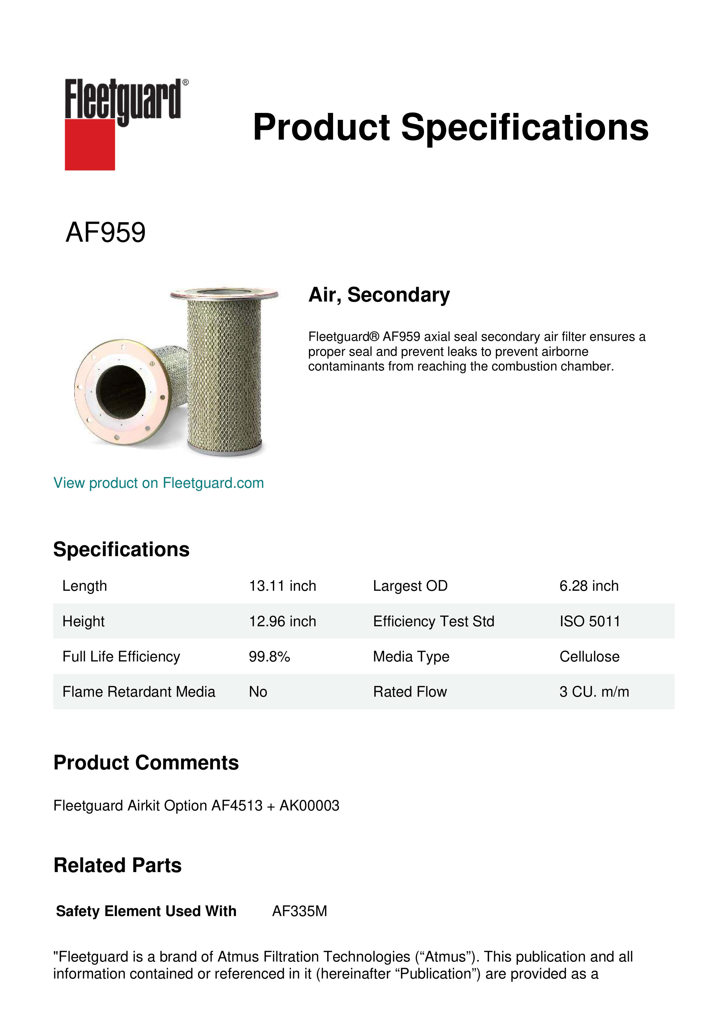 Fleetguard AF959 Replacement Air, Secondary