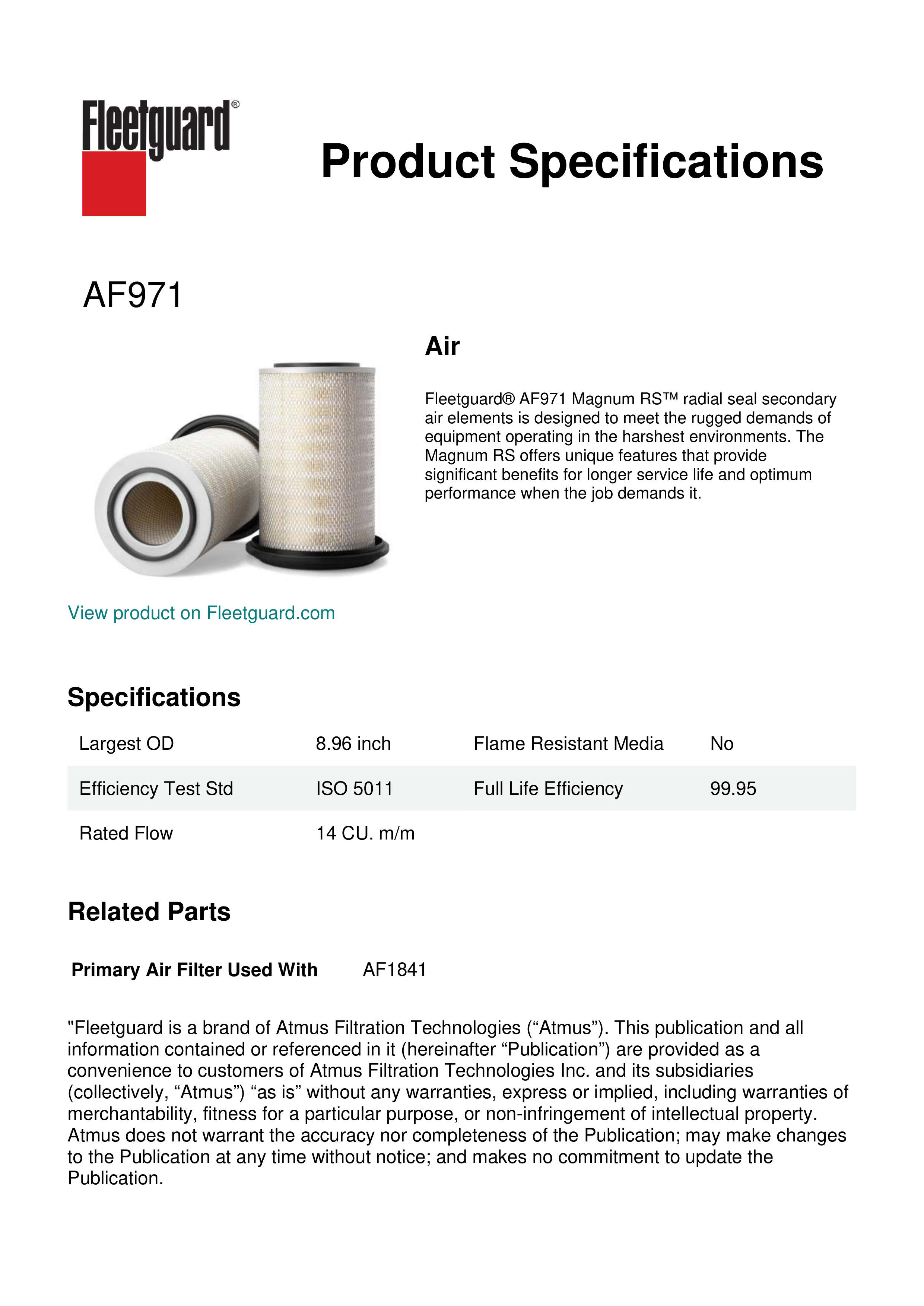 Fleetguard® AF971 Magnum RS™ radial seal secondary air elements is designed to meet the rugged demands of equipment operating in the harshest environments. The Magnum RS offers unique features that provide significant benefits for longer service life and optimum performance when the job demands it.Specification