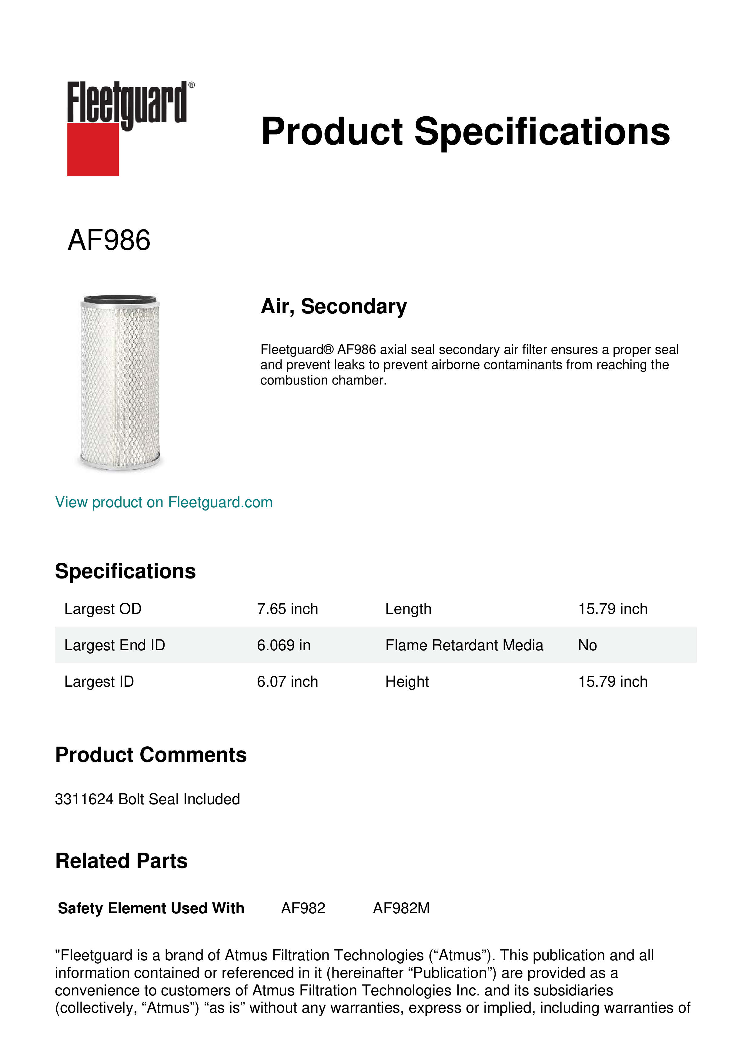 Fleetguard® AF986 axial seal secondary air filter ensures a proper seal and prevent leaks to prevent airborne contaminants from reaching the combustion chamber.Specification