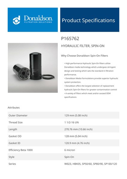 Genuine Donaldson P165762 Hydraulic Filter, Spin-On provides dependable protection for hydraulic systems by efficiently removing particulates and contaminants. It ensures clean hydraulic fluid, promoting smooth operation and extending the lifespan of critical system components.