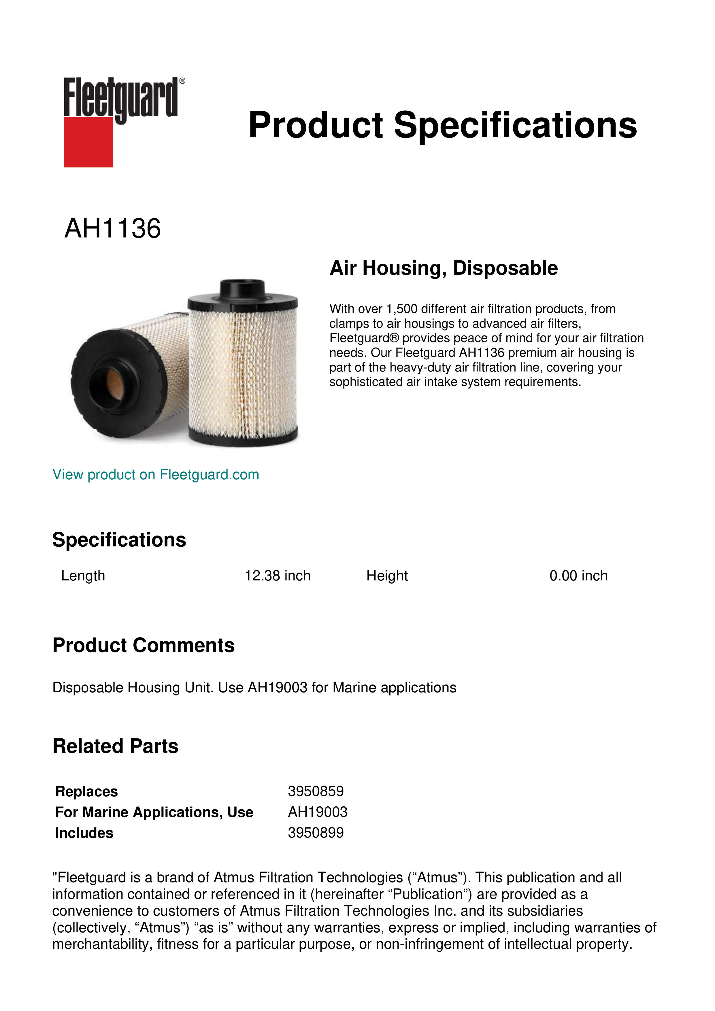 With over 1,500 different air filtration products, from clamps to air housings to advanced air filters, Fleetguard® provides peace of mind for your air filtration needs. Our Fleetguard AH1136 premium air housing is part of the heavy-duty air filtration line, covering your sophisticated air intake system requirements.Specification