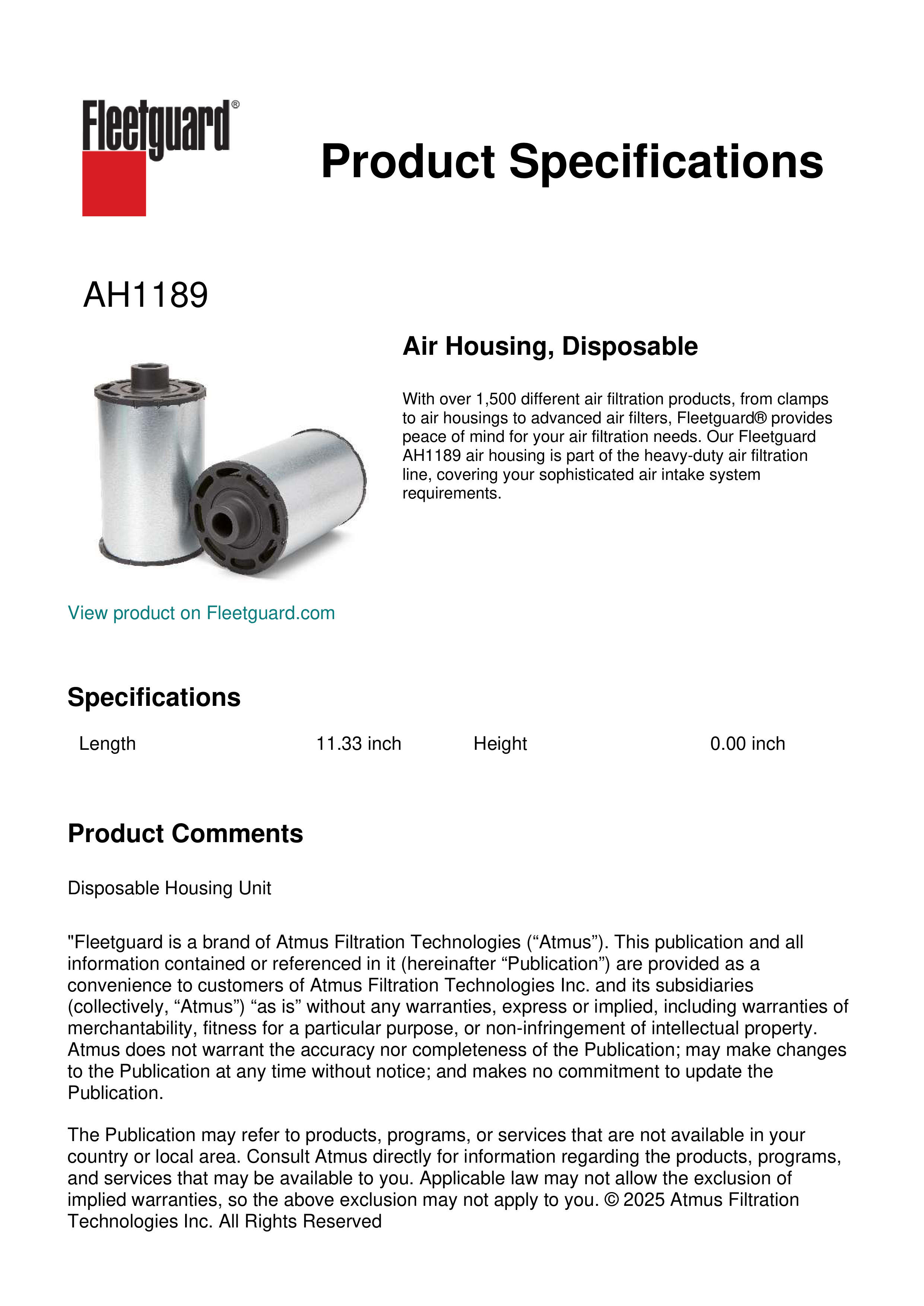 With over 1,500 different air filtration products, from clamps to air housings to advanced air filters, Fleetguard® provides peace of mind for your air filtration needs. Our Fleetguard AH1189 air housing is part of the heavy-duty air filtration line, covering your sophisticated air intake system requirements.Specification