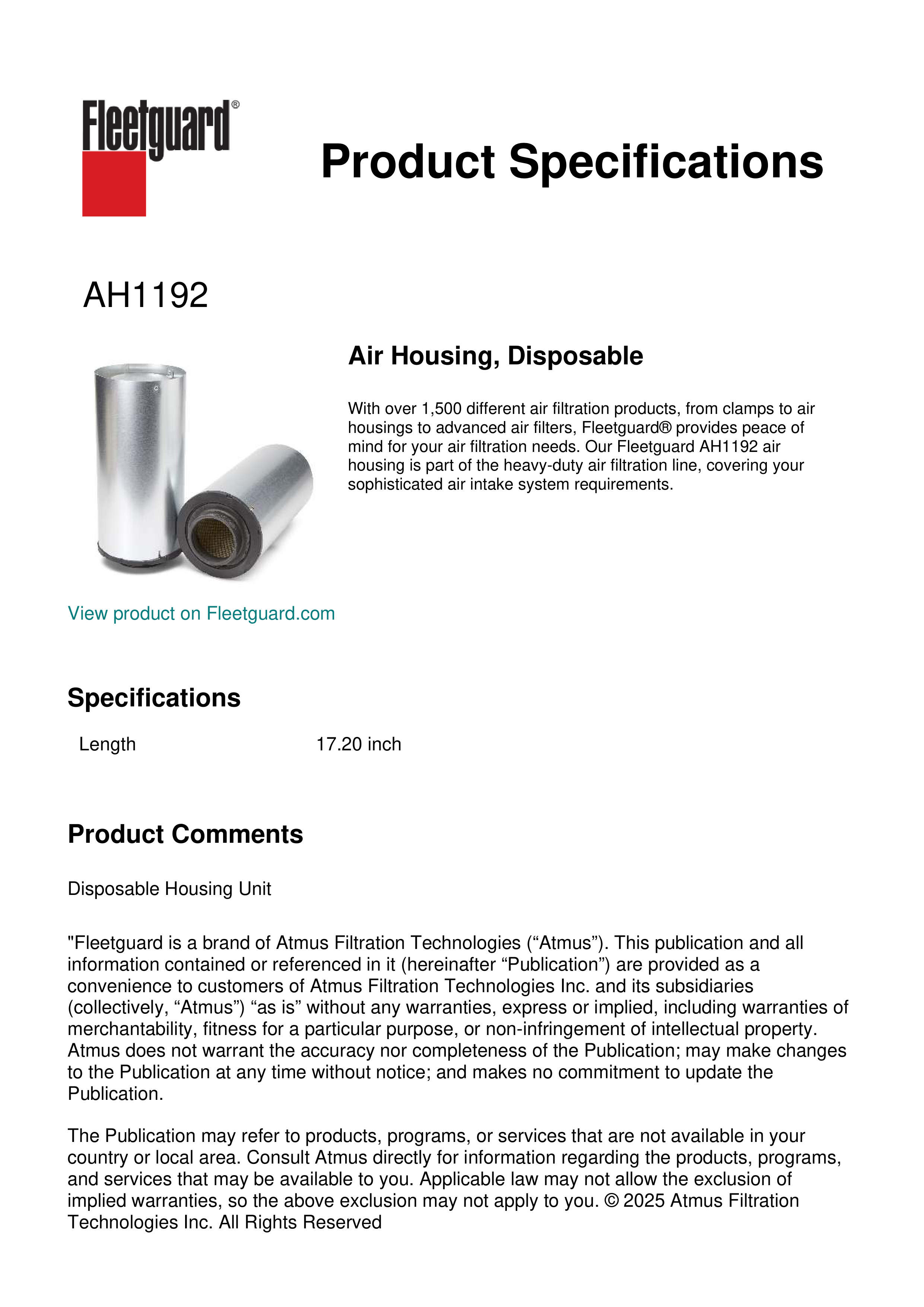 With over 1,500 different air filtration products, from clamps to air housings to advanced air filters, Fleetguard® provides peace of mind for your air filtration needs. Our Fleetguard AH1192 air housing is part of the heavy-duty air filtration line, covering your sophisticated air intake system requirements.Specification