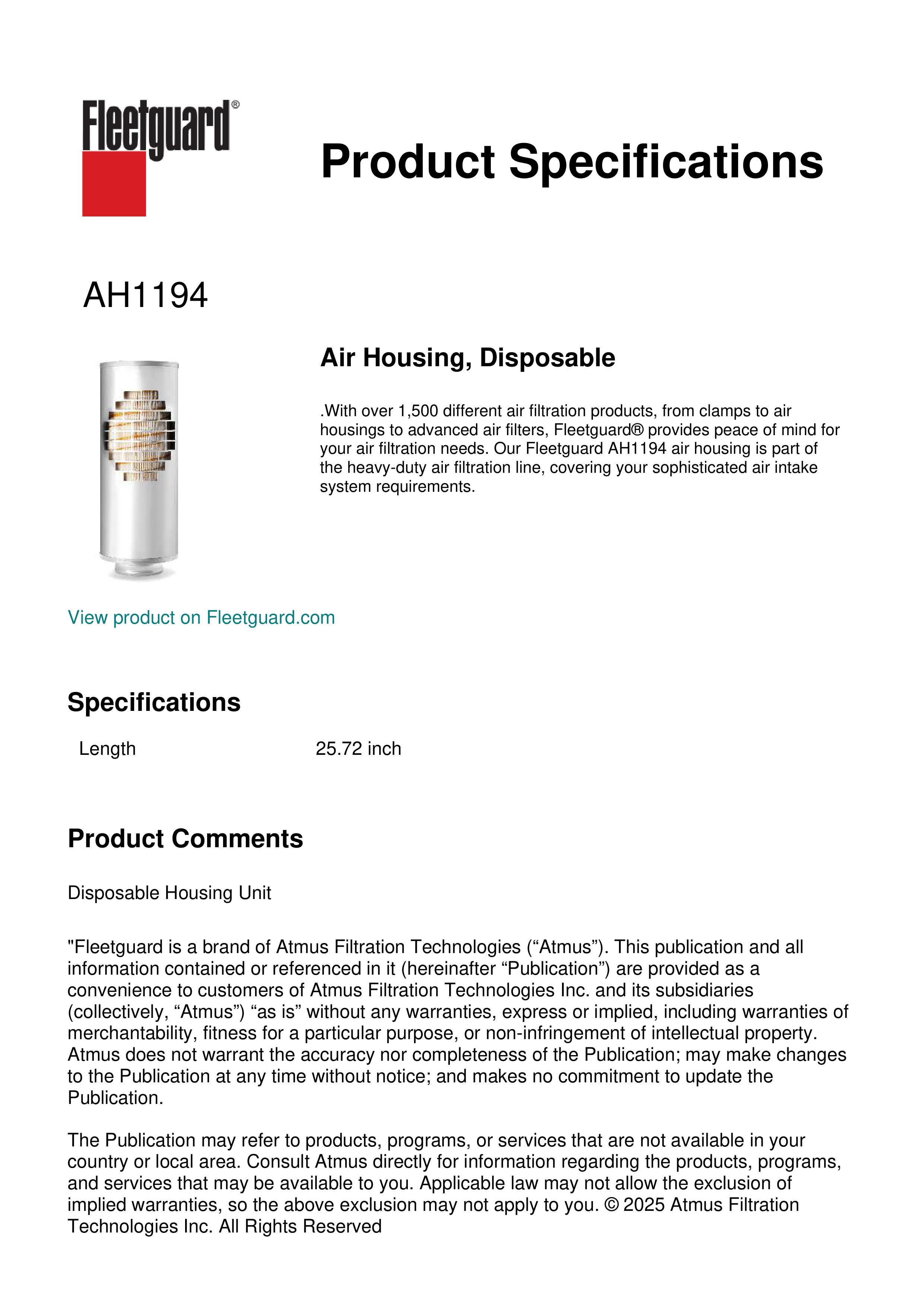 .With over 1,500 different air filtration products, from clamps to air housings to advanced air filters, Fleetguard® provides peace of mind for your air filtration needs. Our Fleetguard AH1194 air housing is part of the heavy-duty air filtration line, covering your sophisticated air intake system requirements.Specification