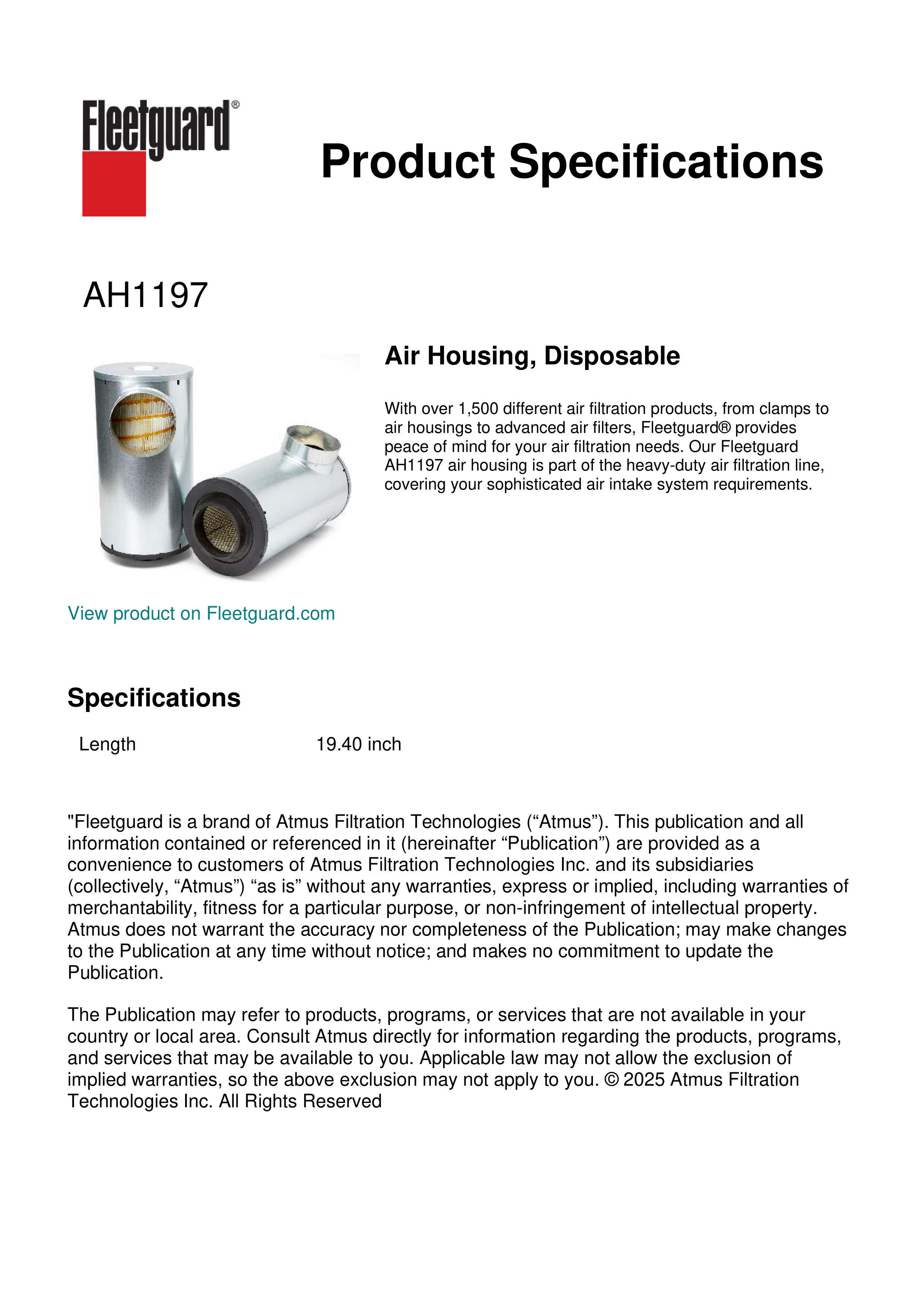 With over 1,500 different air filtration products, from clamps to air housings to advanced air filters, Fleetguard® provides peace of mind for your air filtration needs. Our Fleetguard AH1197 air housing is part of the heavy-duty air filtration line, covering your sophisticated air intake system requirements.Specification
