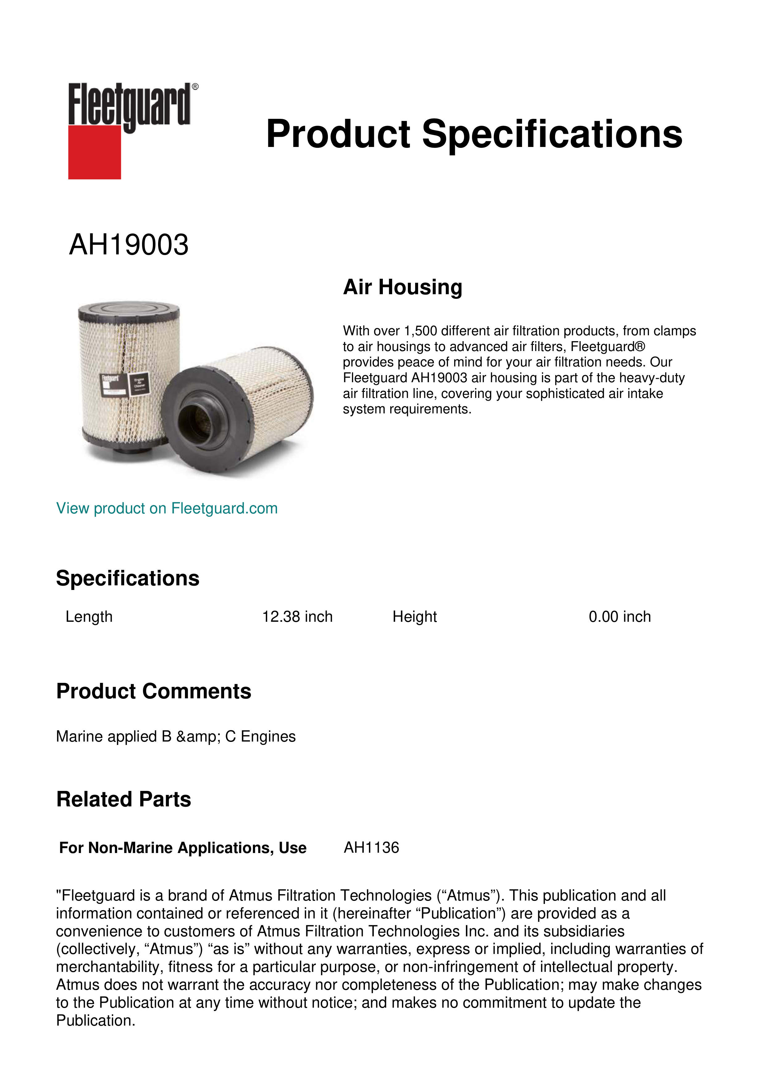 With over 1,500 different air filtration products, from clamps to air housings to advanced air filters, Fleetguard® provides peace of mind for your air filtration needs. Our Fleetguard AH19003 air housing is part of the heavy-duty air filtration line, covering your sophisticated air intake system requirements.Specification