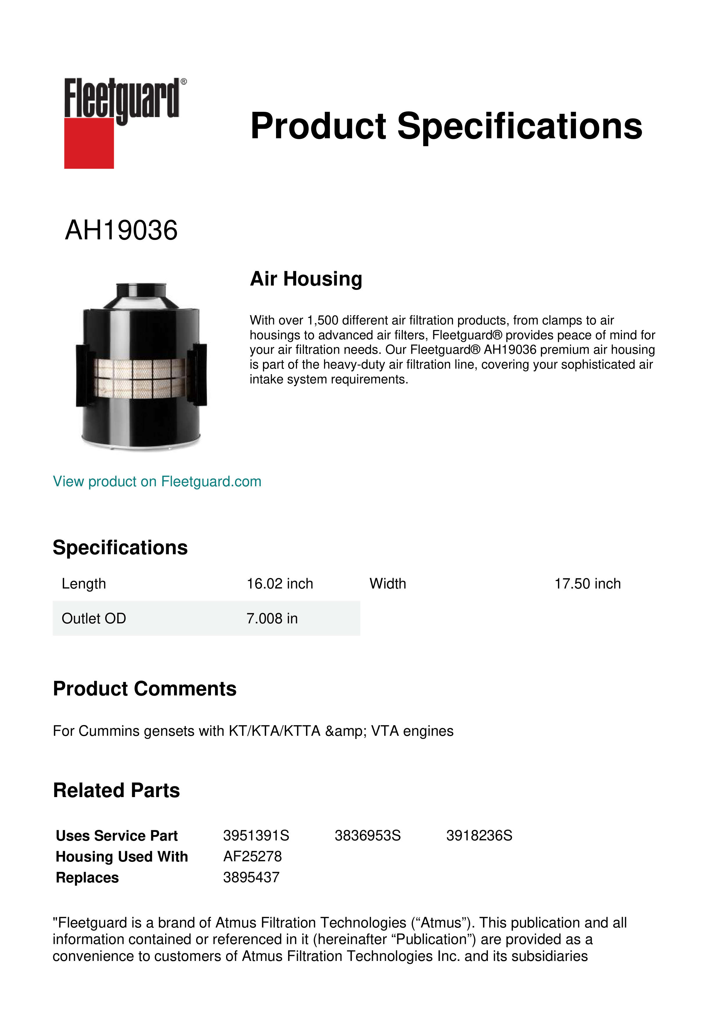 With over 1,500 different air filtration products, from clamps to air housings to advanced air filters, Fleetguard® provides peace of mind for your air filtration needs. Our Fleetguard® AH19036 premium air housing is part of the heavy-duty air filtration line, covering your sophisticated air intake system requirements.Specification