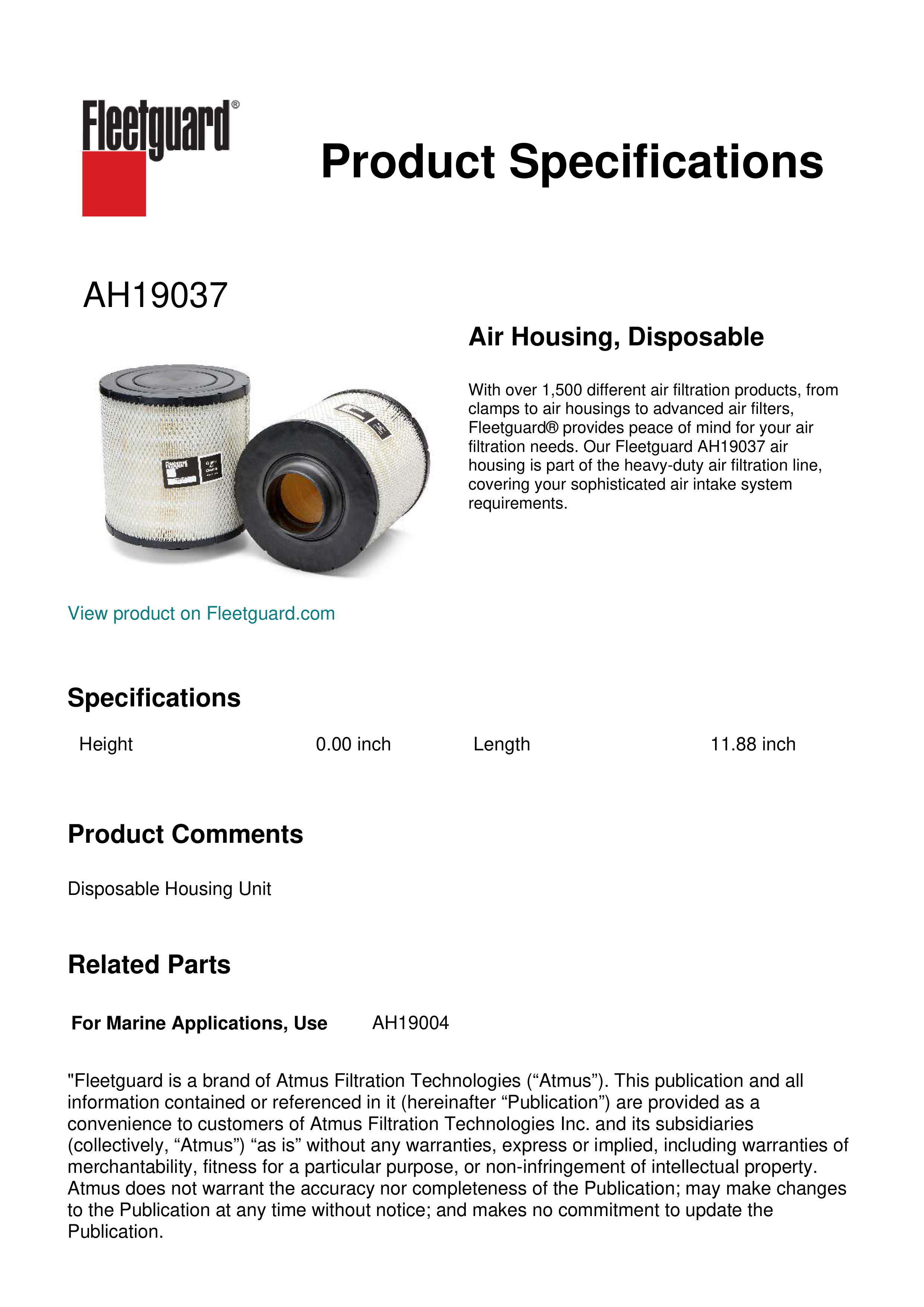 With over 1,500 different air filtration products, from clamps to air housings to advanced air filters, Fleetguard® provides peace of mind for your air filtration needs. Our Fleetguard AH19037 air housing is part of the heavy-duty air filtration line, covering your sophisticated air intake system requirements.Specification