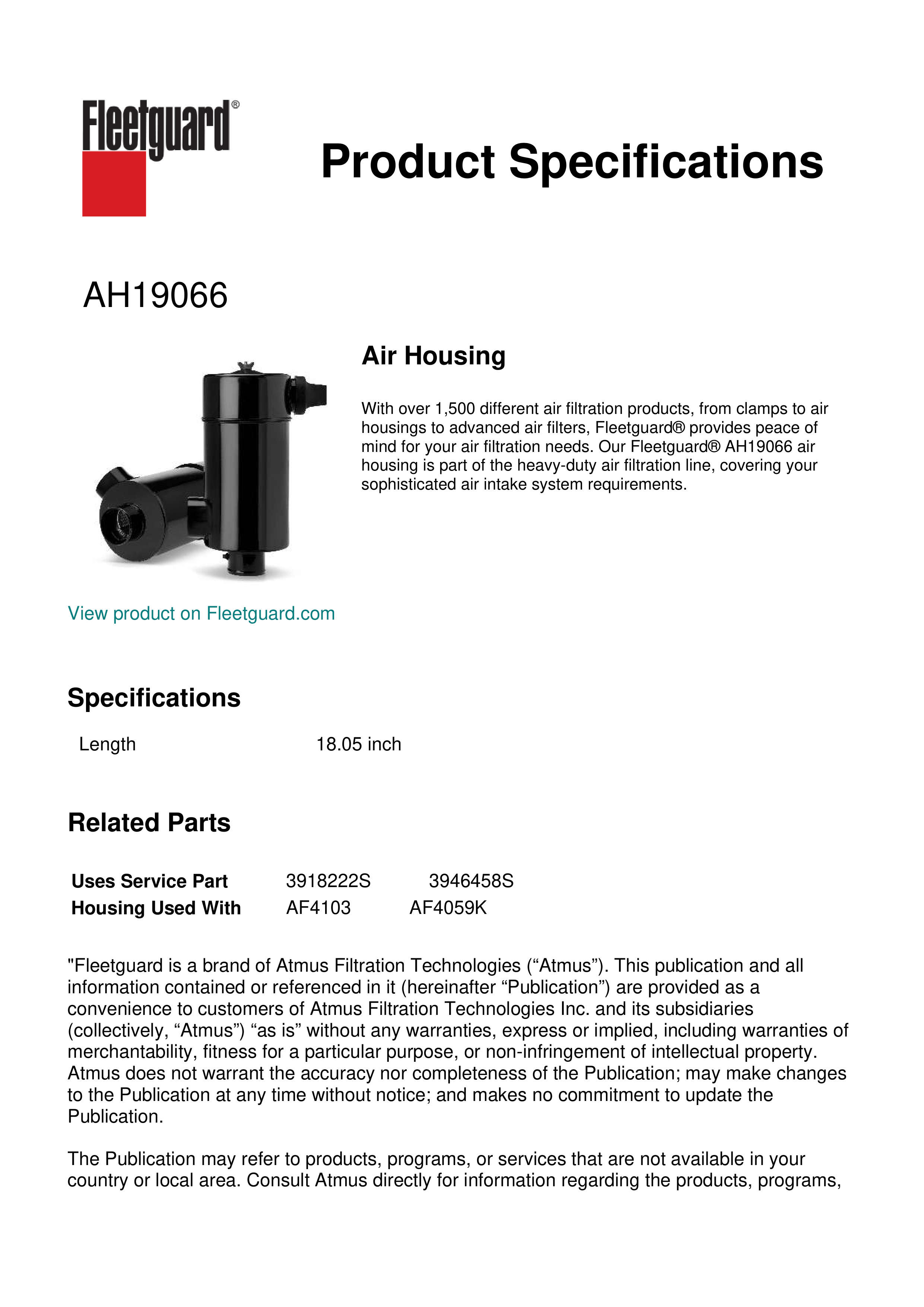 With over 1,500 different air filtration products, from clamps to air housings to advanced air filters, Fleetguard® provides peace of mind for your air filtration needs. Our Fleetguard® AH19066 air housing is part of the heavy-duty air filtration line, covering your sophisticated air intake system requirements.Specification