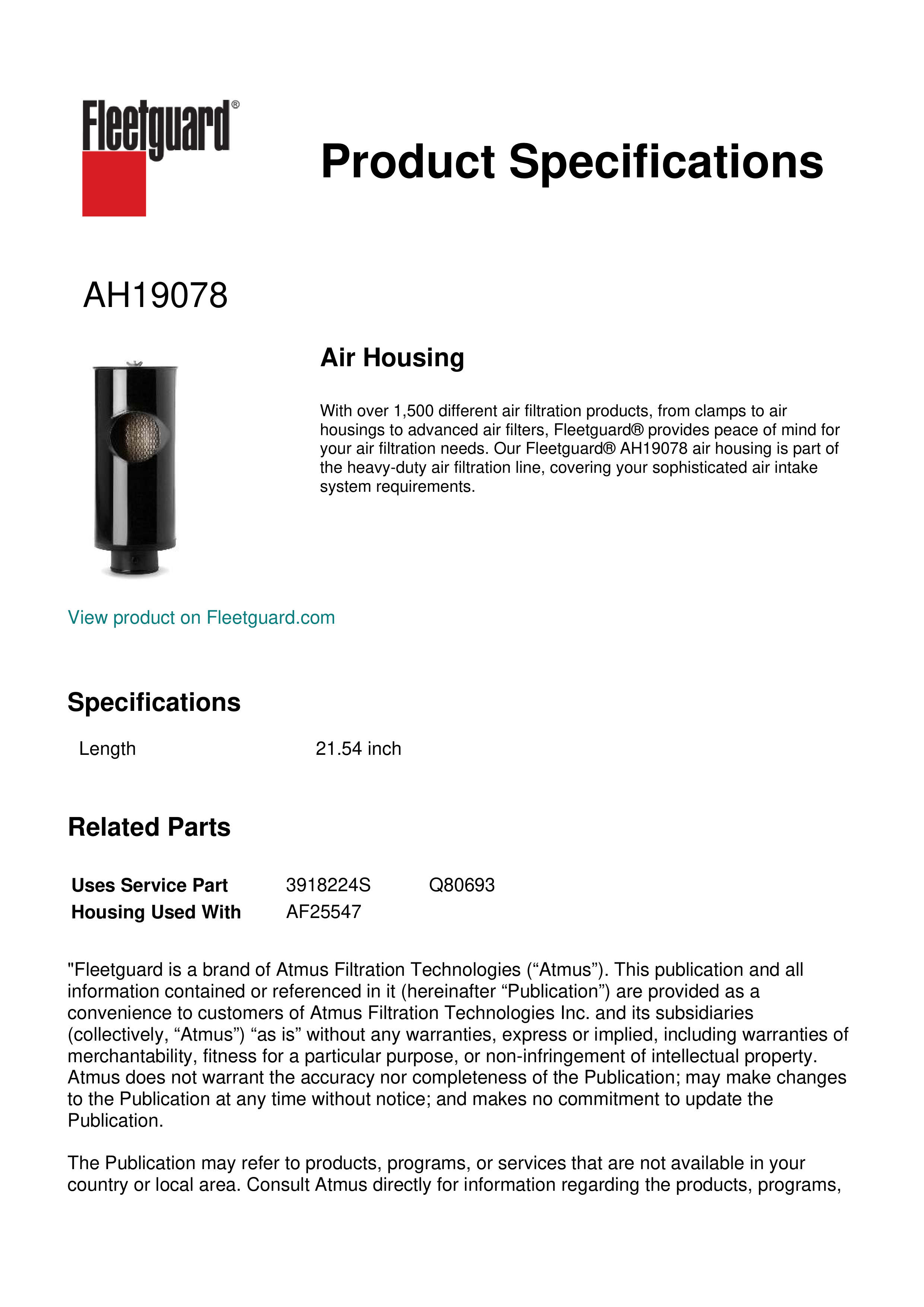 With over 1,500 different air filtration products, from clamps to air housings to advanced air filters, Fleetguard® provides peace of mind for your air filtration needs. Our Fleetguard® AH19078 air housing is part of the heavy-duty air filtration line, covering your sophisticated air intake system requirements.Specification