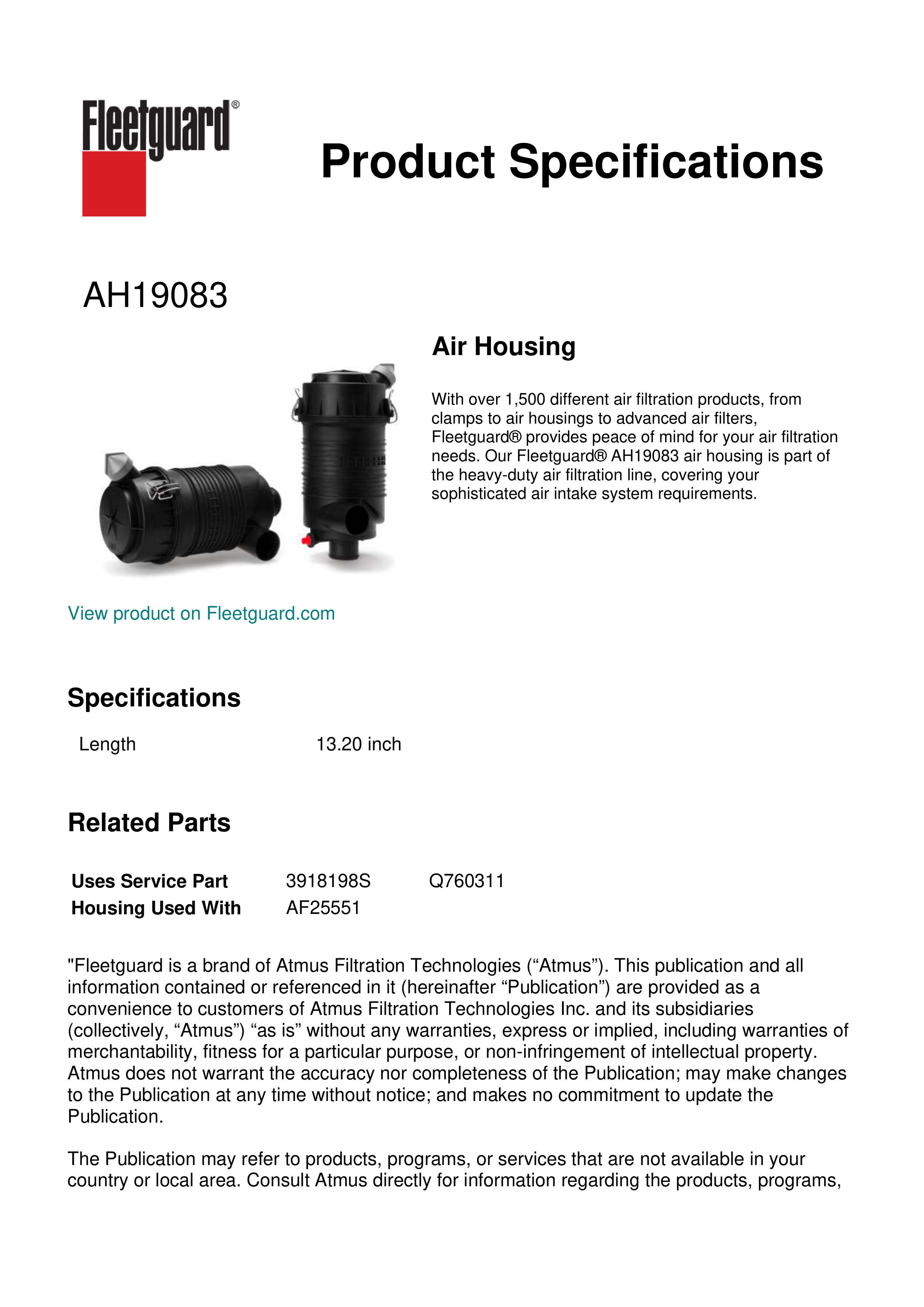 With over 1,500 different air filtration products, from clamps to air housings to advanced air filters, Fleetguard® provides peace of mind for your air filtration needs. Our Fleetguard® AH19083 air housing is part of the heavy-duty air filtration line, covering your sophisticated air intake system requirements.Specification