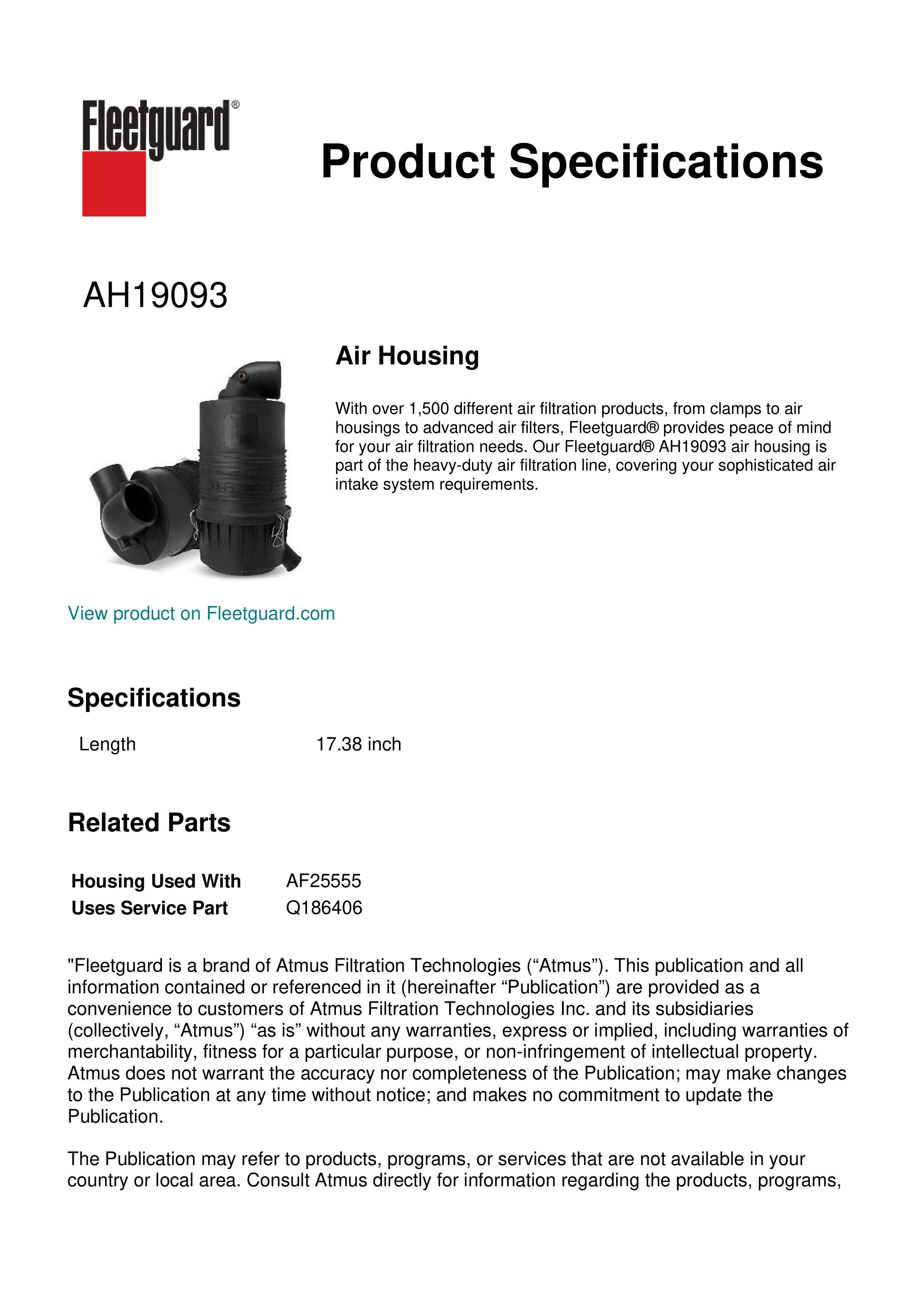 With over 1,500 different air filtration products, from clamps to air housings to advanced air filters, Fleetguard® provides peace of mind for your air filtration needs. Our Fleetguard® AH19093 air housing is part of the heavy-duty air filtration line, covering your sophisticated air intake system requirements.Specification