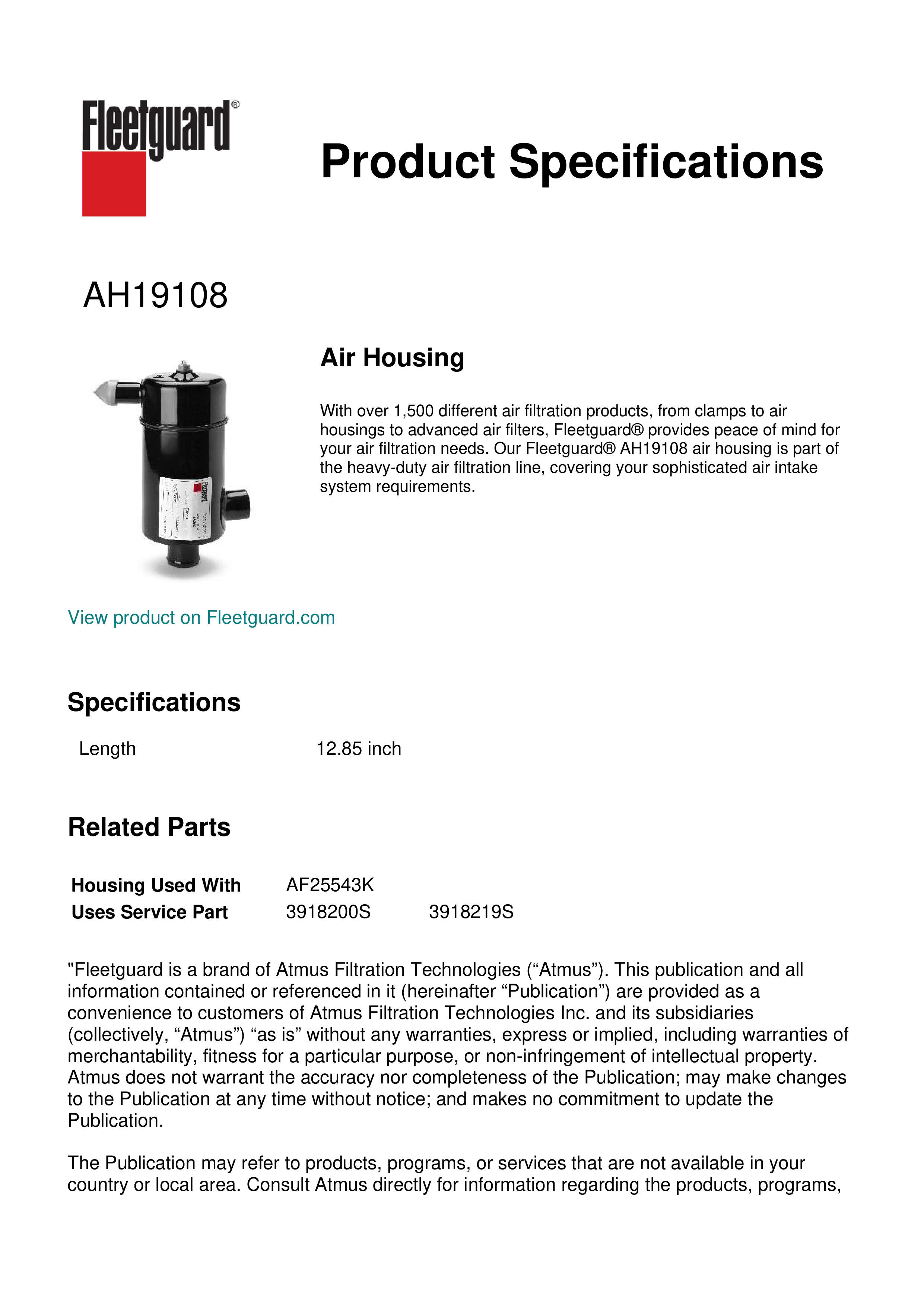 With over 1,500 different air filtration products, from clamps to air housings to advanced air filters, Fleetguard® provides peace of mind for your air filtration needs. Our Fleetguard® AH19108 air housing is part of the heavy-duty air filtration line, covering your sophisticated air intake system requirements.Specification