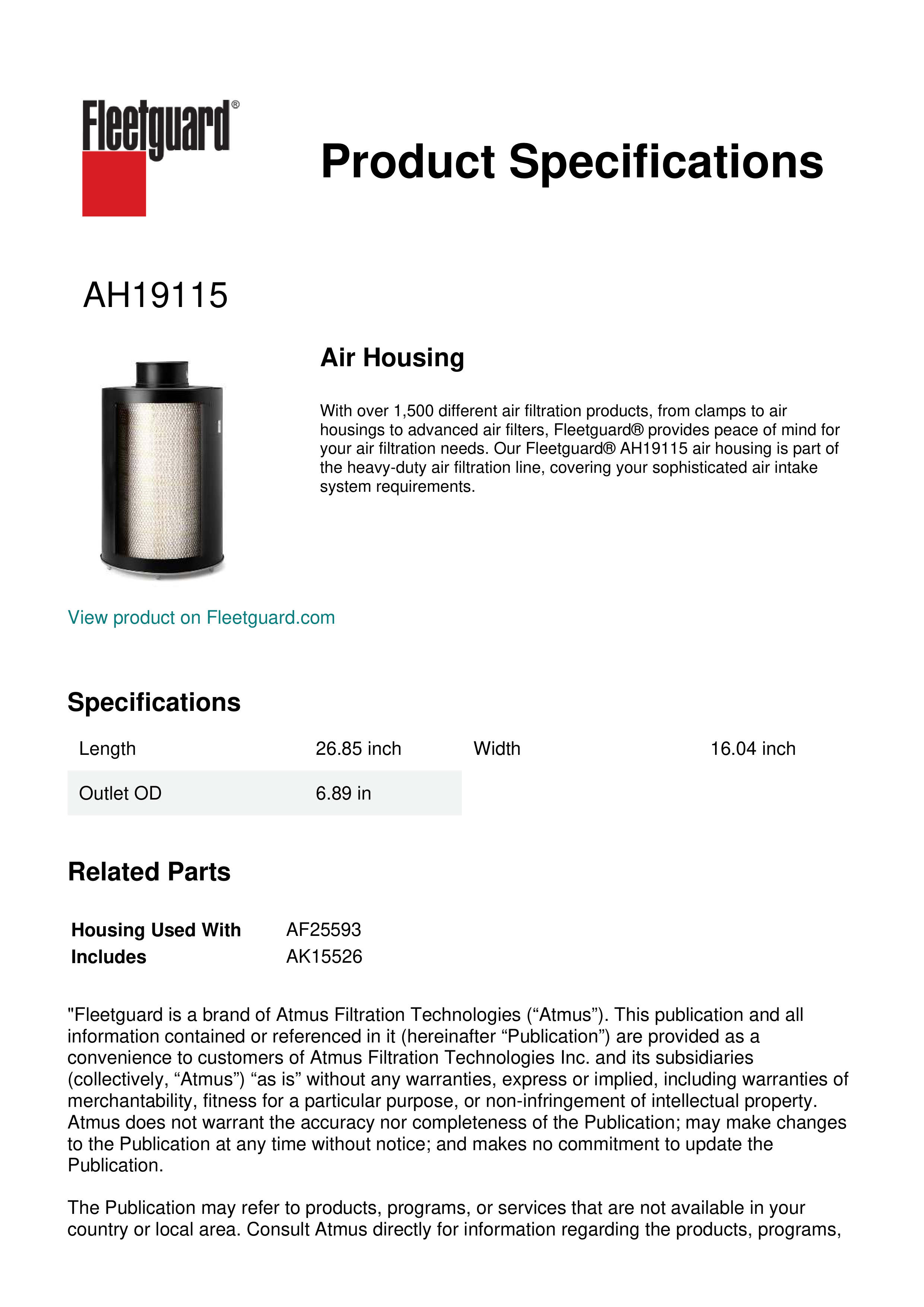 With over 1,500 different air filtration products, from clamps to air housings to advanced air filters, Fleetguard® provides peace of mind for your air filtration needs. Our Fleetguard® AH19115 air housing is part of the heavy-duty air filtration line, covering your sophisticated air intake system requirements.Specification