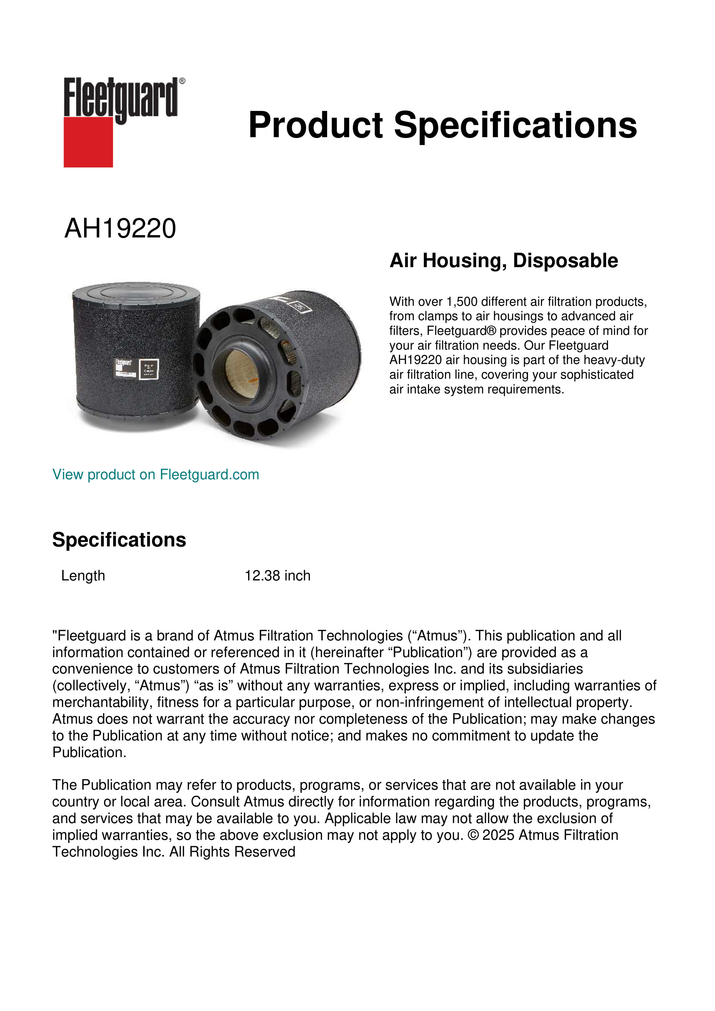 With over 1,500 different air filtration products, from clamps to air housings to advanced air filters, Fleetguard® provides peace of mind for your air filtration needs. Our Fleetguard AH19220 air housing is part of the heavy-duty air filtration line, covering your sophisticated air intake system requirements.Specification