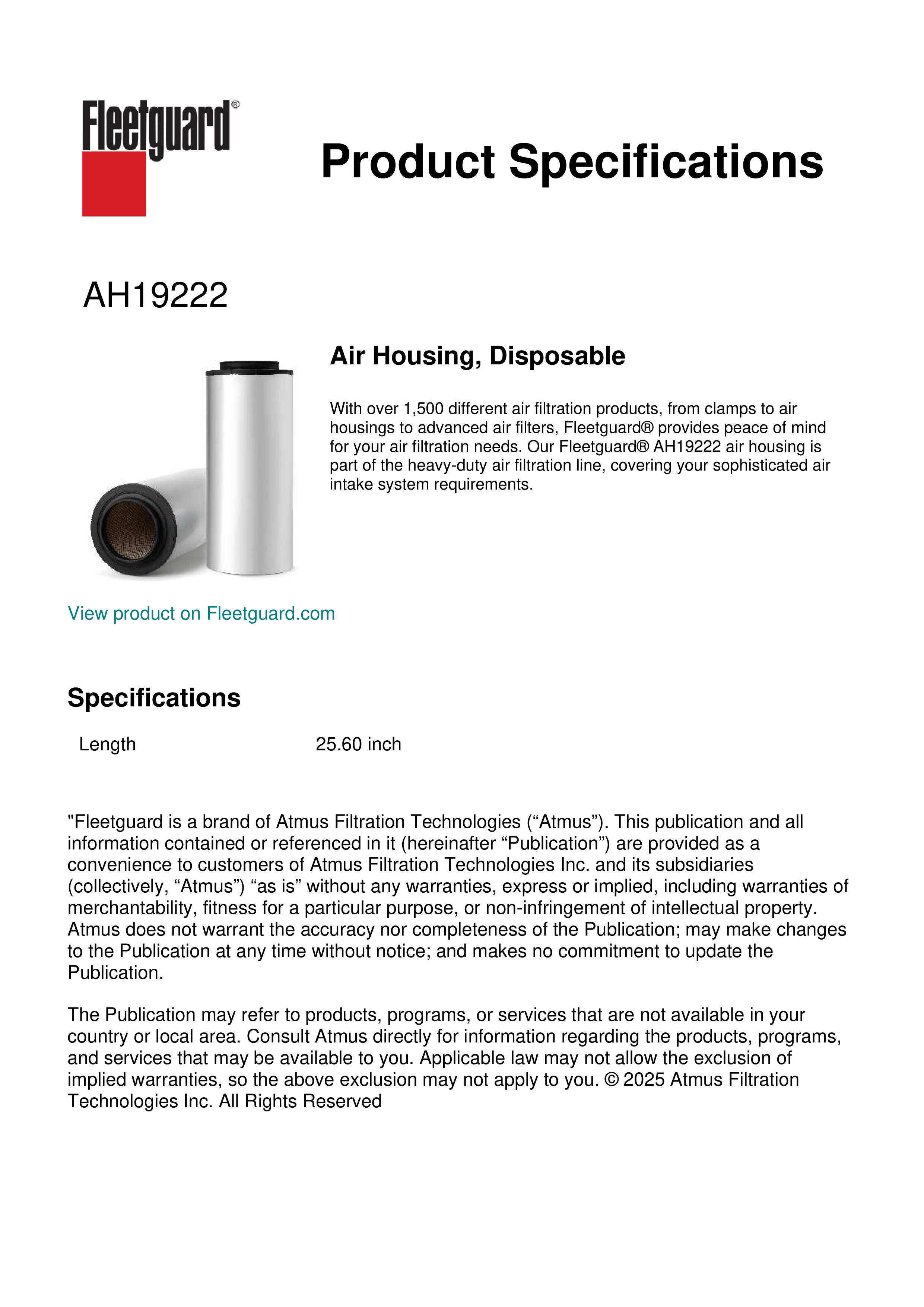 With over 1,500 different air filtration products, from clamps to air housings to advanced air filters, Fleetguard® provides peace of mind for your air filtration needs. Our Fleetguard® AH19222 air housing is part of the heavy-duty air filtration line, covering your sophisticated air intake system requirements.Specification